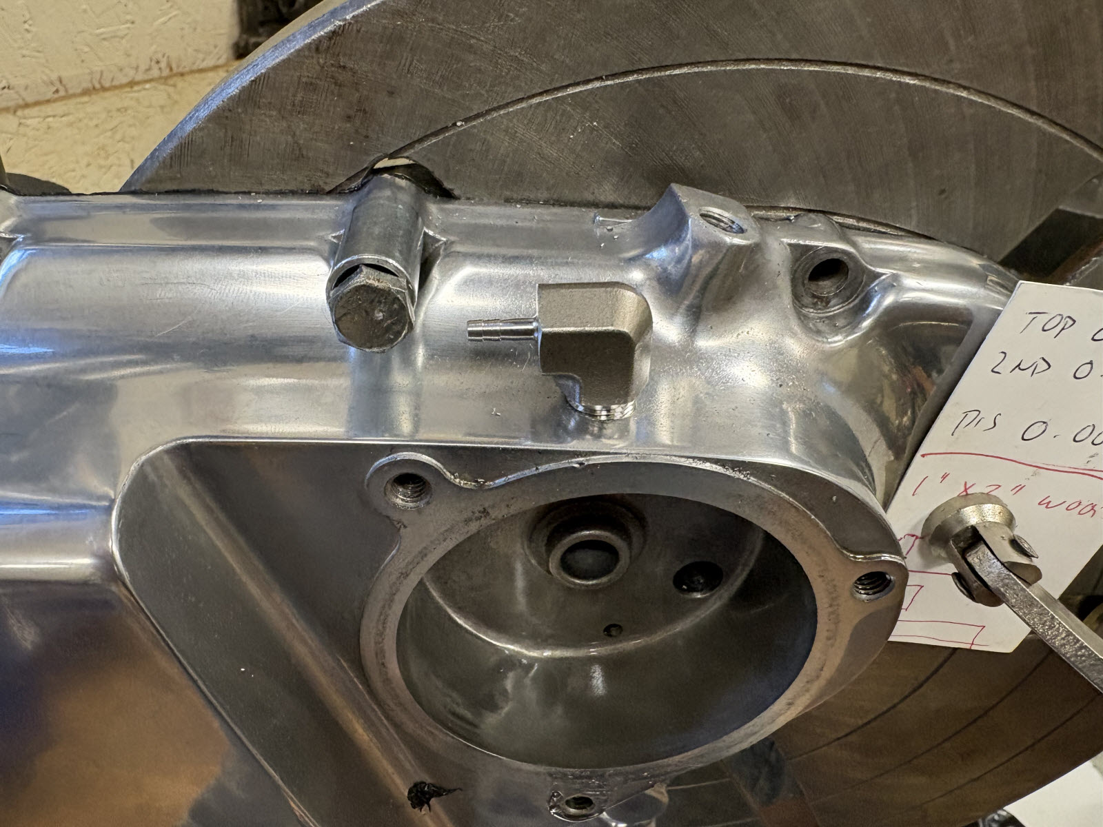 I found this 1/8"NPT x 1/8" hose 90 degree stainless fitting that will work well. There is a thickened section of the clutch cover right at the top that has plenty of metal to drill and thread to hold the fitting. I can adapt the fitting to hold a carb jet. My trial on a spare cover shows that I must use a proper handle for the tap - I was using a wrench and it pulled the tap crooked while I was cutting the threads. (The square hex on the tap is larger than the tap handle that I have).