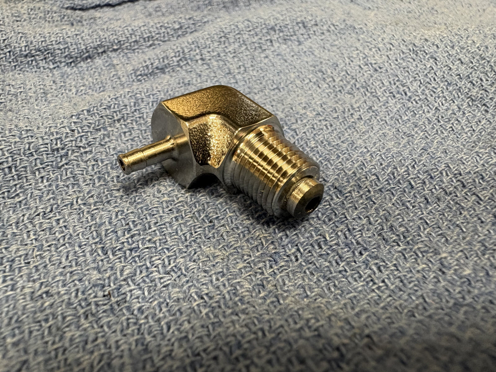 The hole in the bottom of the 90 degree fitting was too big of an ID to use a standard carb jet. I first had to tap it for a 6mm thread, then make a 6mm x 4mm threaded bushing. Then I threaded the bushing in place and locked it with JB Weld.