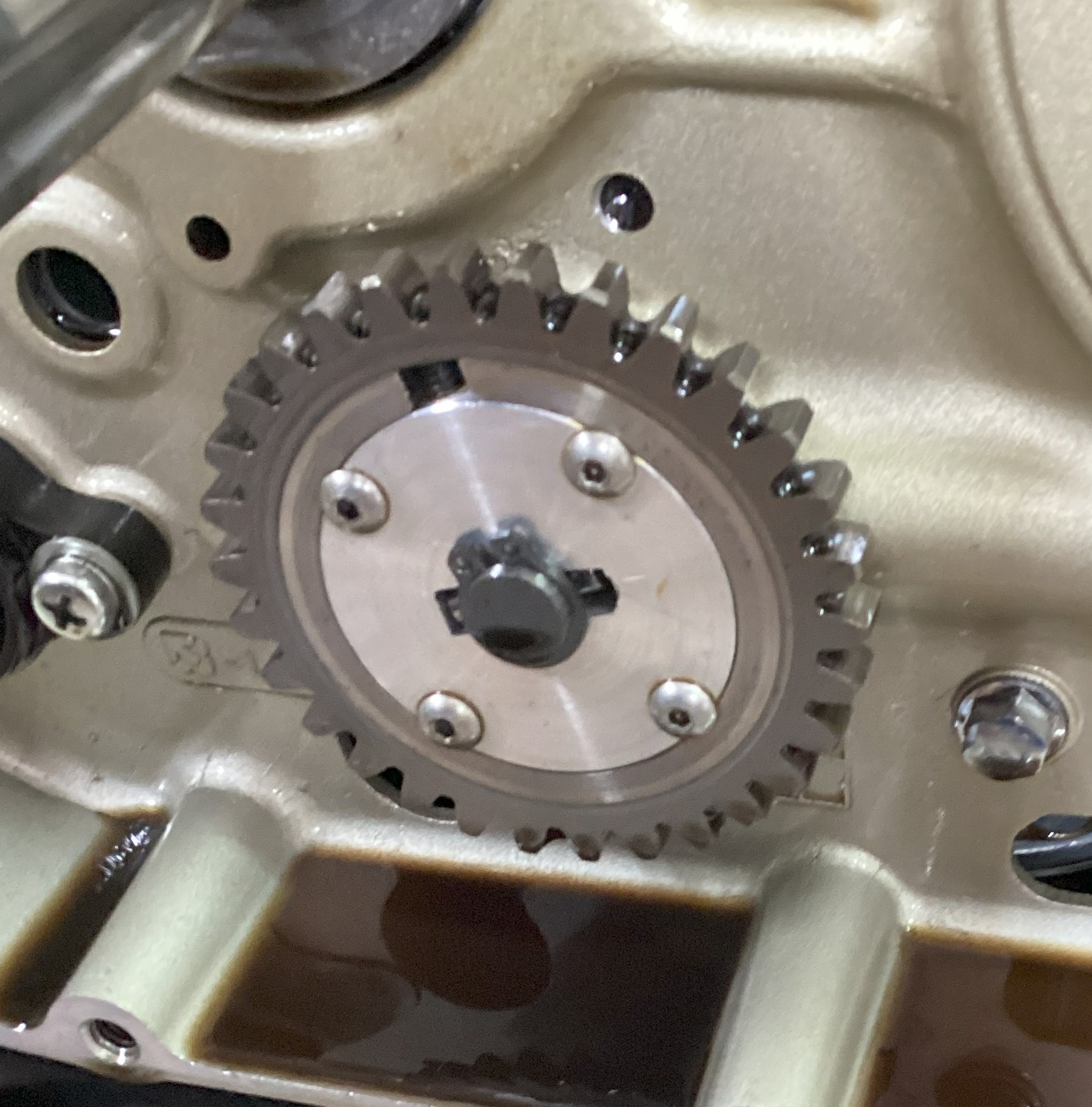 The oil pump driven gear was also in excellent condition. Screws tight. Gear teeth smooth. Fit on the pump shaft and drive pin was tight. Snap ring integrity good.