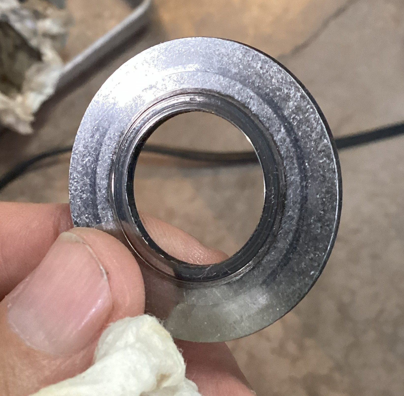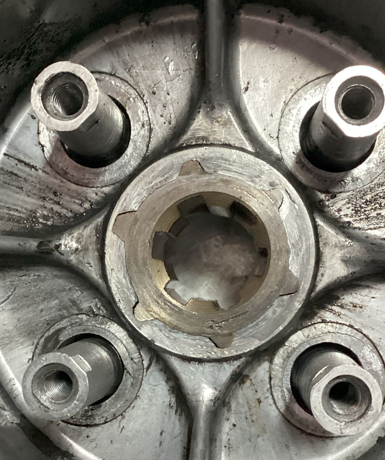 The back of the clutch hub was scored. I assume that could be attributed to the loose nut, but it’s a chicken or egg problem. Did the nut loosen and allow relative motion between the thrust washer and hub, or did the washer fret away and relieve the preload resulting in a loose nut. I contend we will never know. Just gotta routinely tighten the nut. You can also see that the steel insert on this ancient DR hub is starting to separate.