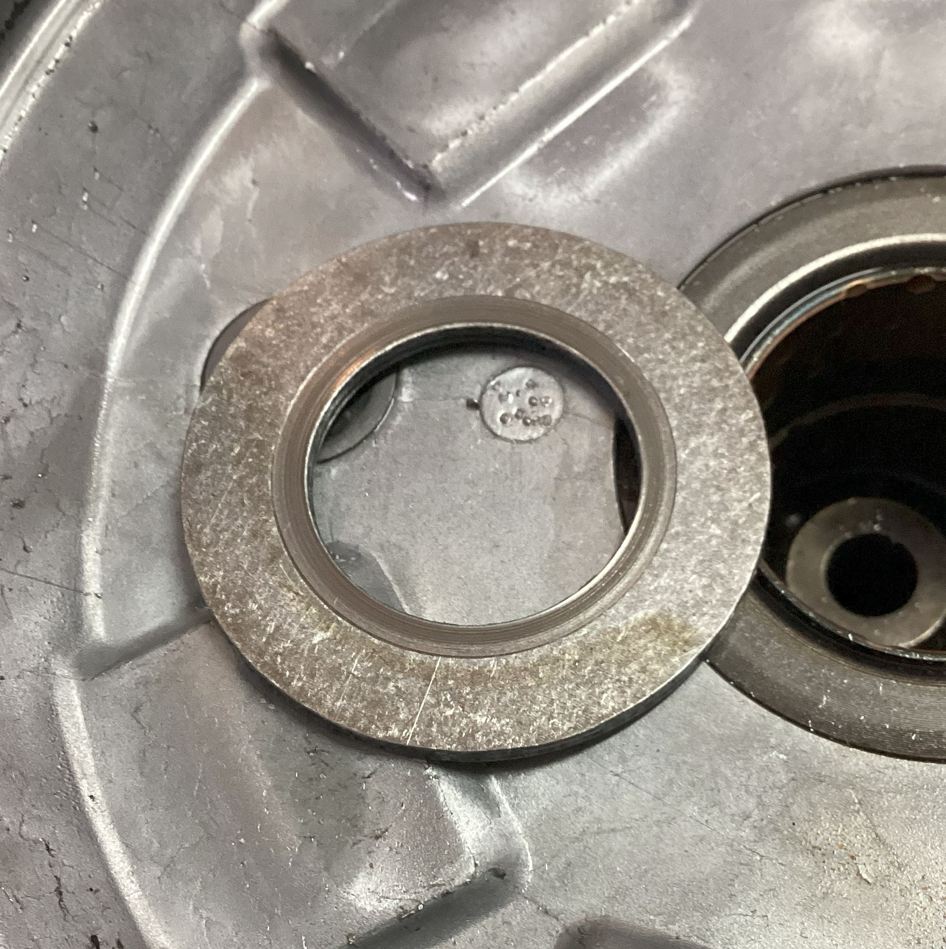 The thrust washers were worn. I will have to replace them. This is the inner washer that resides up against the input shaft ball bearing.