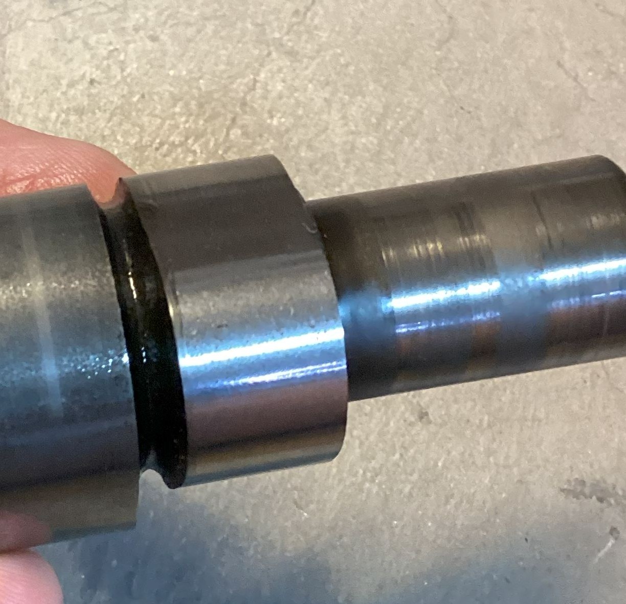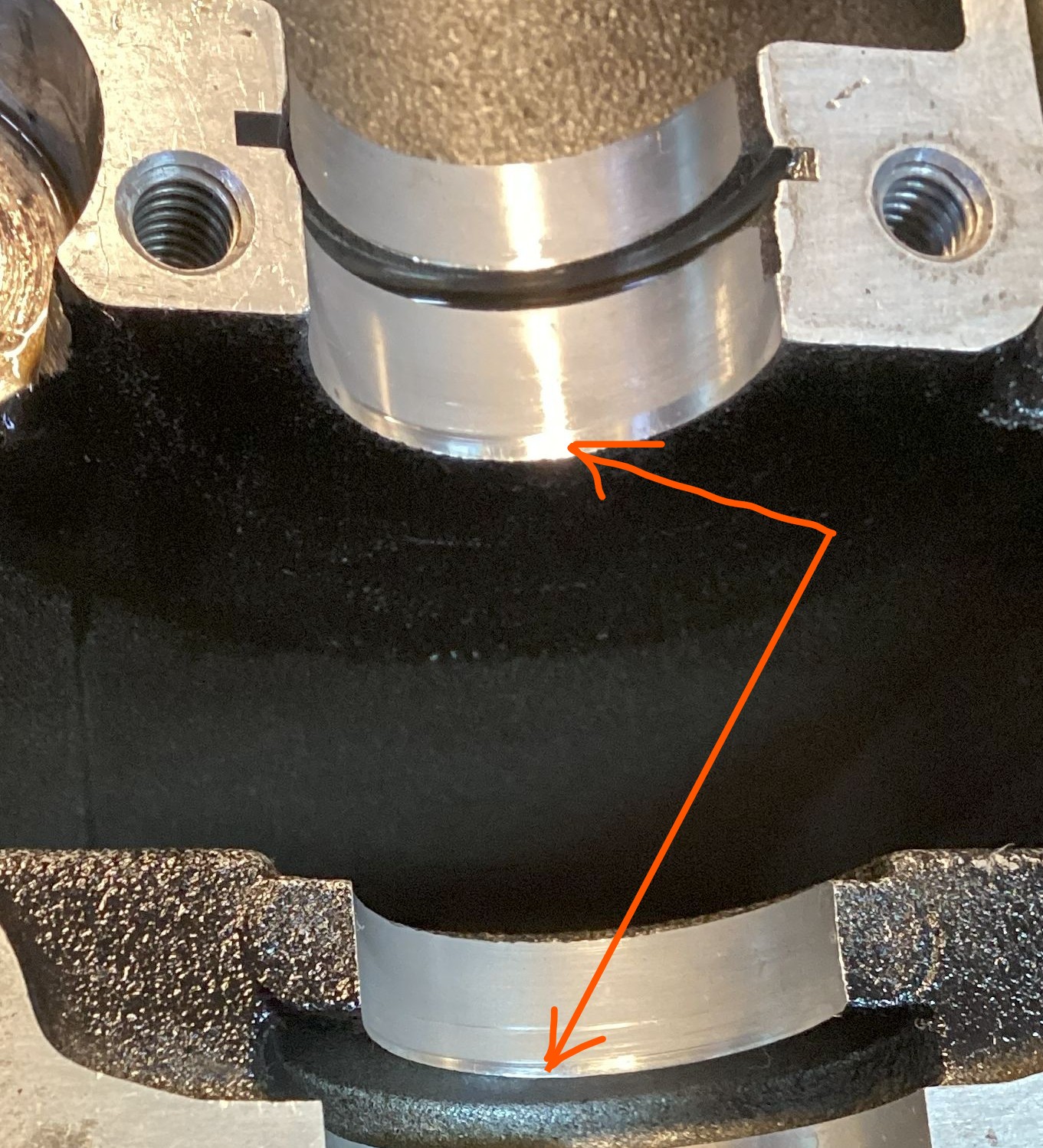 There are narrow polished circumferential bands on the center cam bearing and right-hand steady bearing. It appears there is some edge loading taking place. I’m not sure why, but it doesn’t seem to be causing any significant distress.