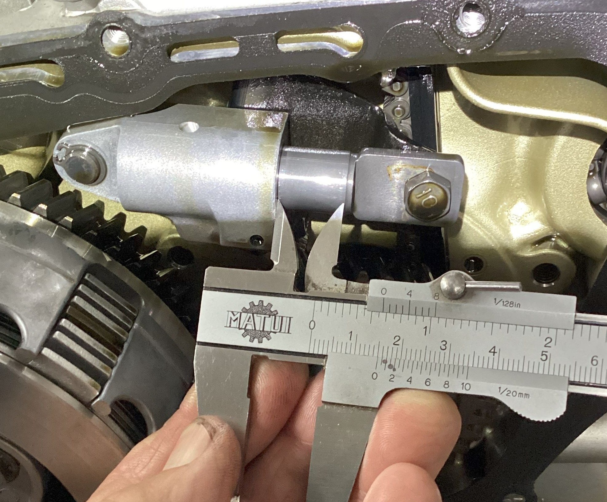 As you can see from the previous photos, the cam journals looked excellent, and so did the cam bearings in the head cover. The cam bearings in the cylinder head were also in good condition. The measured clearance between the cam journals and cam bearings was just under .002”, well below the service limit of .006”.