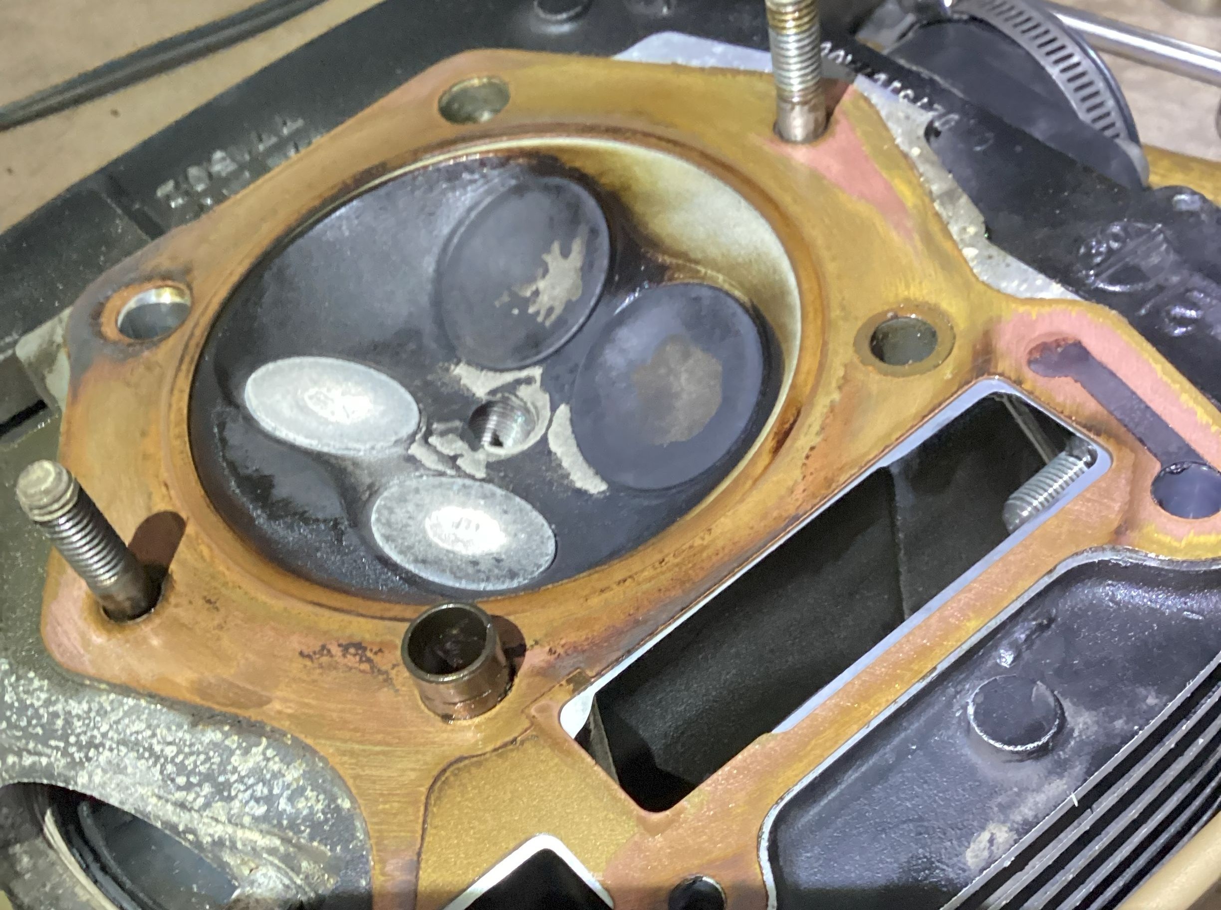 When I removed the cylinder head, the gasket was dry. Prior to going to an external feed system, this gasket was always full of oil when I removed the cylinder head. A welcome sight, no oil on the gasket. Note how clean the deck is just behind the intake valves.
