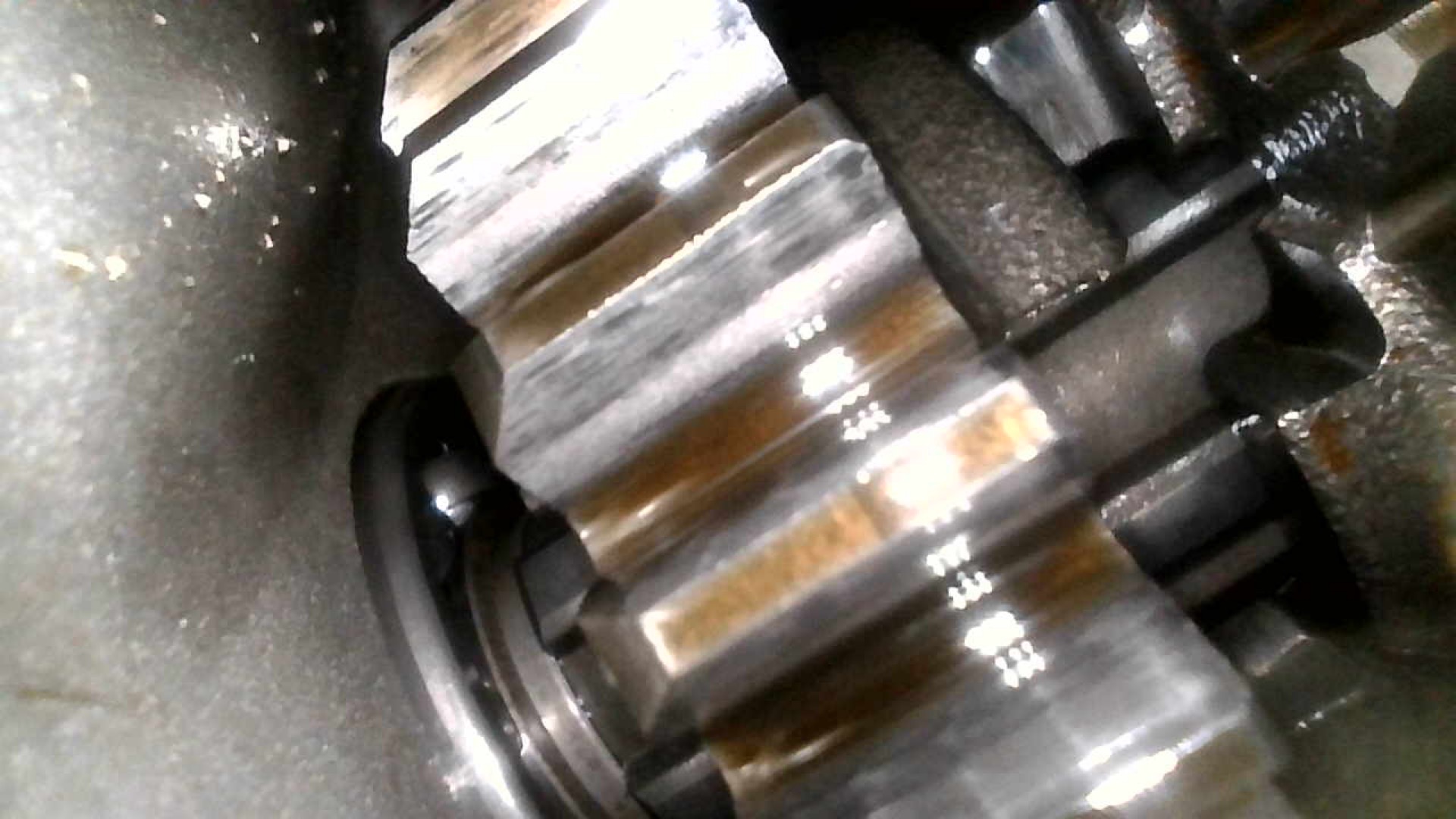 Once the cylinder was out of the way, I had a clear view of the transmission input gears. All is well. No pitting.