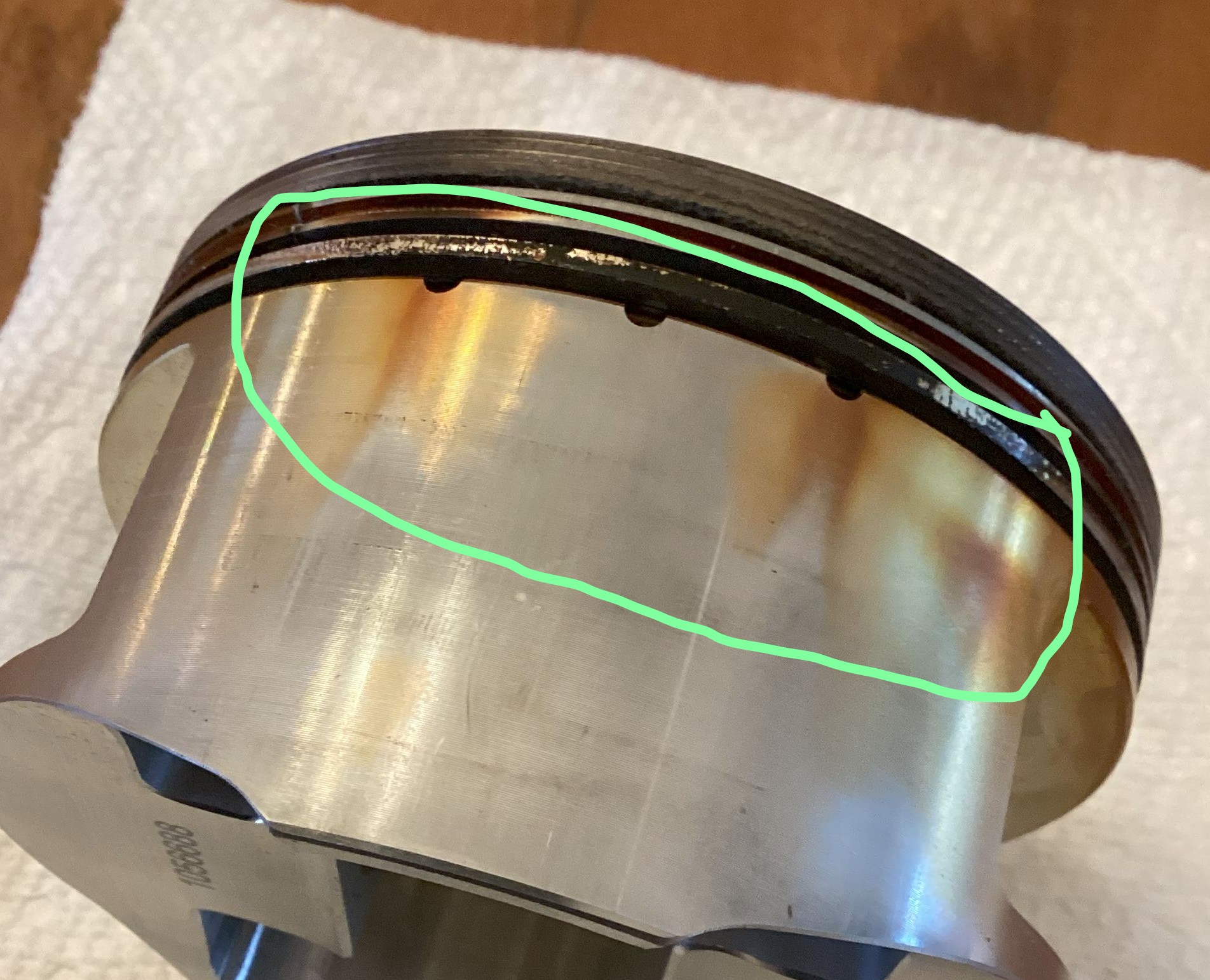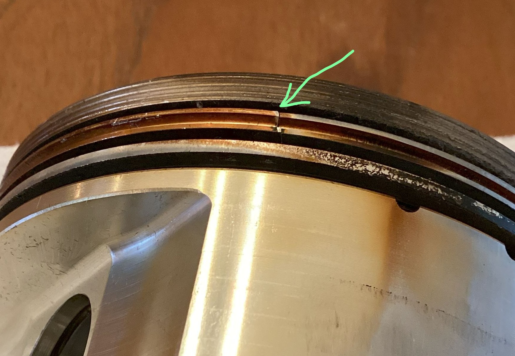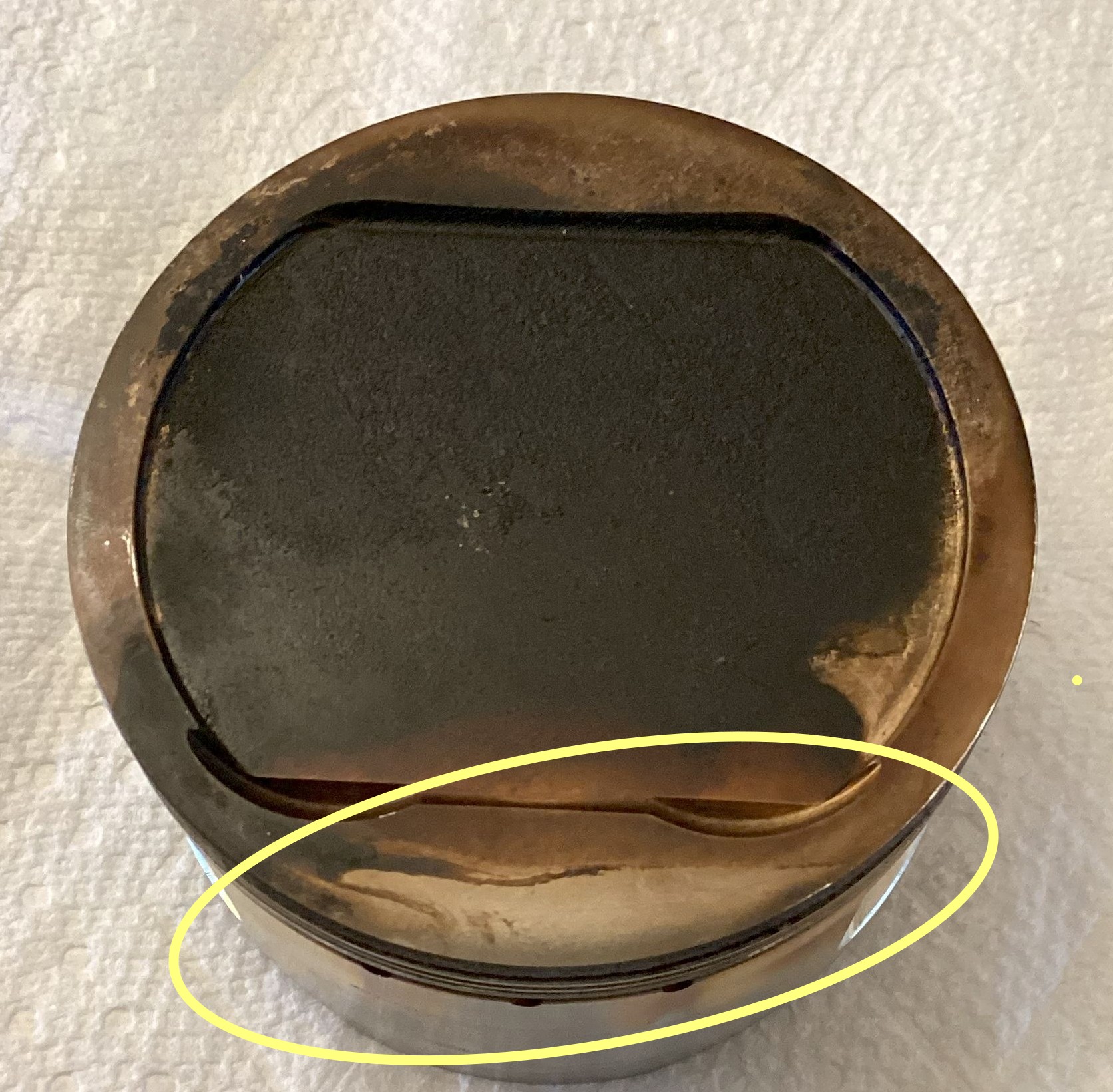 And you can see how the combustion gas was blowing by the compression ring. That brown coking/shellac tells the story. The hot combustion gas just blew through the circumferential crack in the ring land and overwhelmed the oil scraper ring.