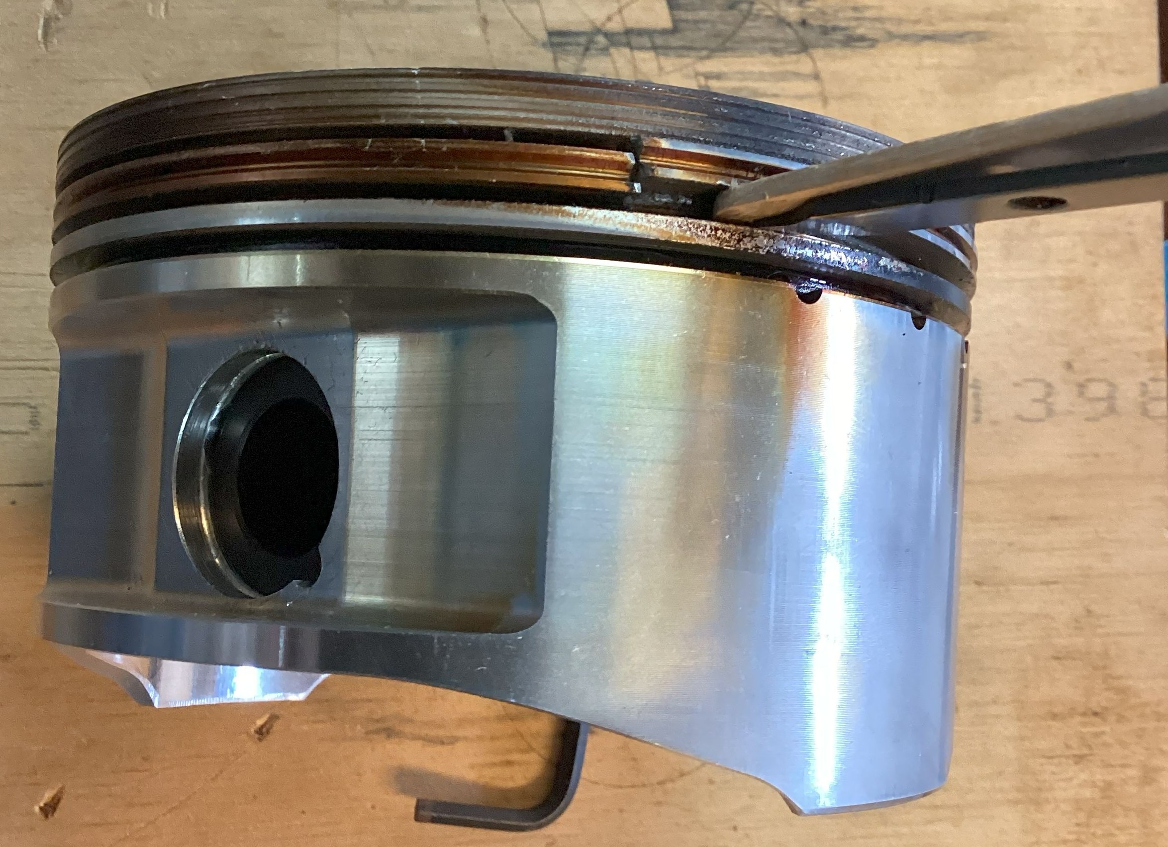 The area on the circumference just above the compression ring has the same sandblasted texture that I saw on the pop-top. The sandblasting is in those detonation suppression grooves, and it is confined to the back side of the piston.