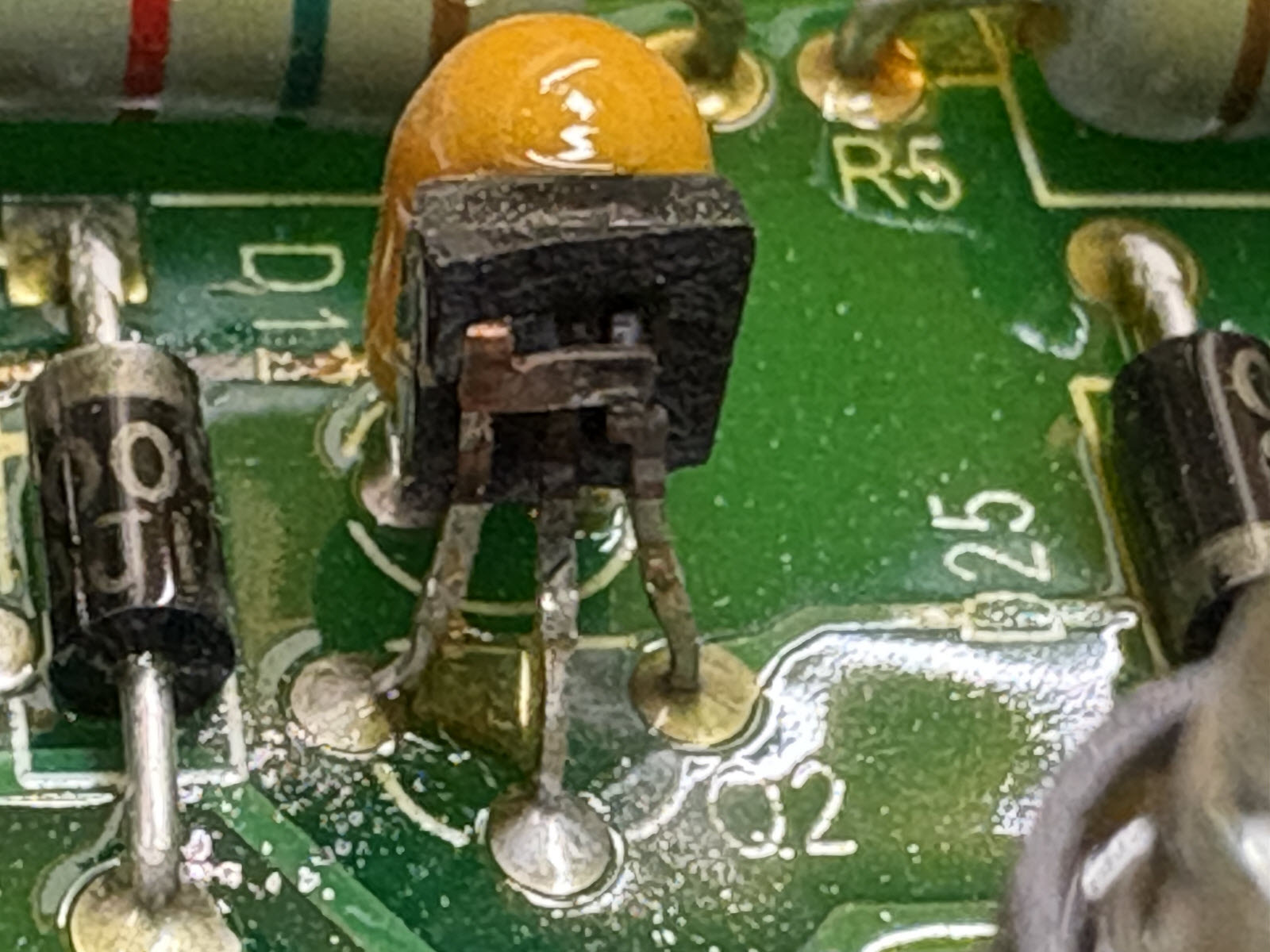 There are 5 of these on the circuit board and this is the only one that has failed - the others have a semicircular plastic coating on the side that is exposed/burned on this one.