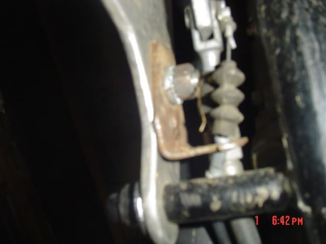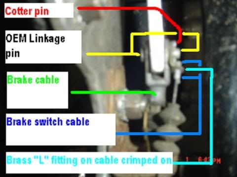 It seems to be just a pin (not sure of the size) with your average garden variety cotter pin in it. It should be the same one holding the rear brake cable on the linkage. Just take it loose and add the brake switch cable to it. The same pin holds it all to the pedal/extension (whichever the case may be).