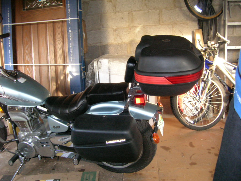 I bought a 7 Dollar tool box from Walmart and it sits on the Suzuki Luggage rack with a couple of bungees. It is 18 inches long, 9-10 ins wide and about 10in deep. It has a tool tray that I took out for more room. Also with a long hasp padlock I can lock it to the sissy bar (I don't have a pad). It can also be locked to keep out honest people. if you want it on semi permanent you could bolt it on. The things I will say about it is, as it stands it is not water proof and opening it on the bike requires a bit of a knack. best to take it off and put it on the floor