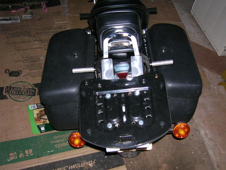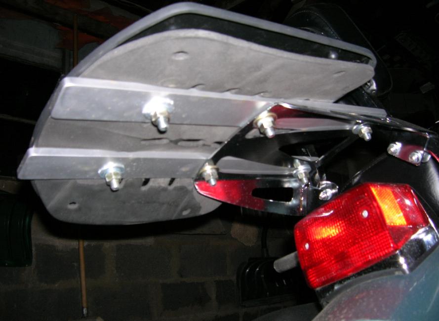 First, look at the mounting position.  With the sissybar in place, the trunk itself (as well as its mounting plate) is pushed almost to the end of the luggage rack.  In fact, the mounting plate extends almost 8" beyond the end of the luggage rack.  That extension increases the torque stress on the rack mount.  In otherwords, the farther back you mount the trunk, the more stress you are putting on the luggage rack. (think the principle of leverage)