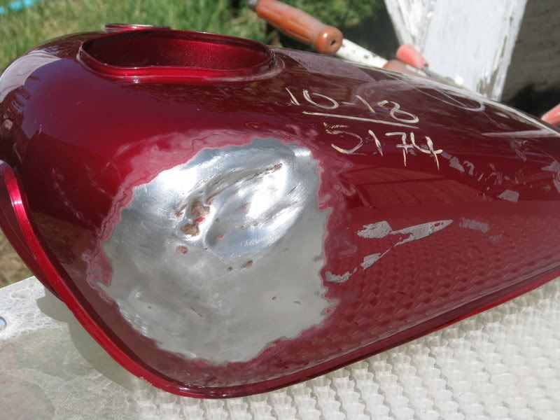 I was a bodyman for 3 years. I have the tools.I would need a Brad tool, that welds a brass tack to the tank, then pull on that to get the wrinkles out. I am still rasslin the Honda, of the 10 head bolt holes, 9 require a tap & findiong the tap has become a bit of a mystery. The one a machinist handed me just doesnt feel right. the one good hole that the new bolts run in freely wont allow the tap to run in, so I have to make certain I have the right one. I dont think I do.