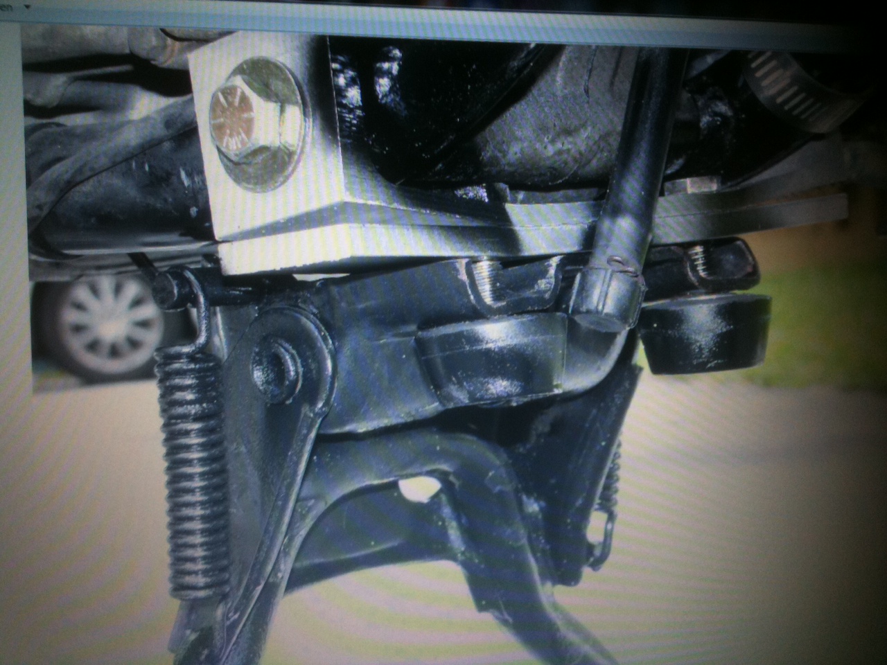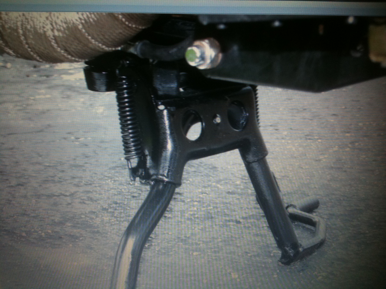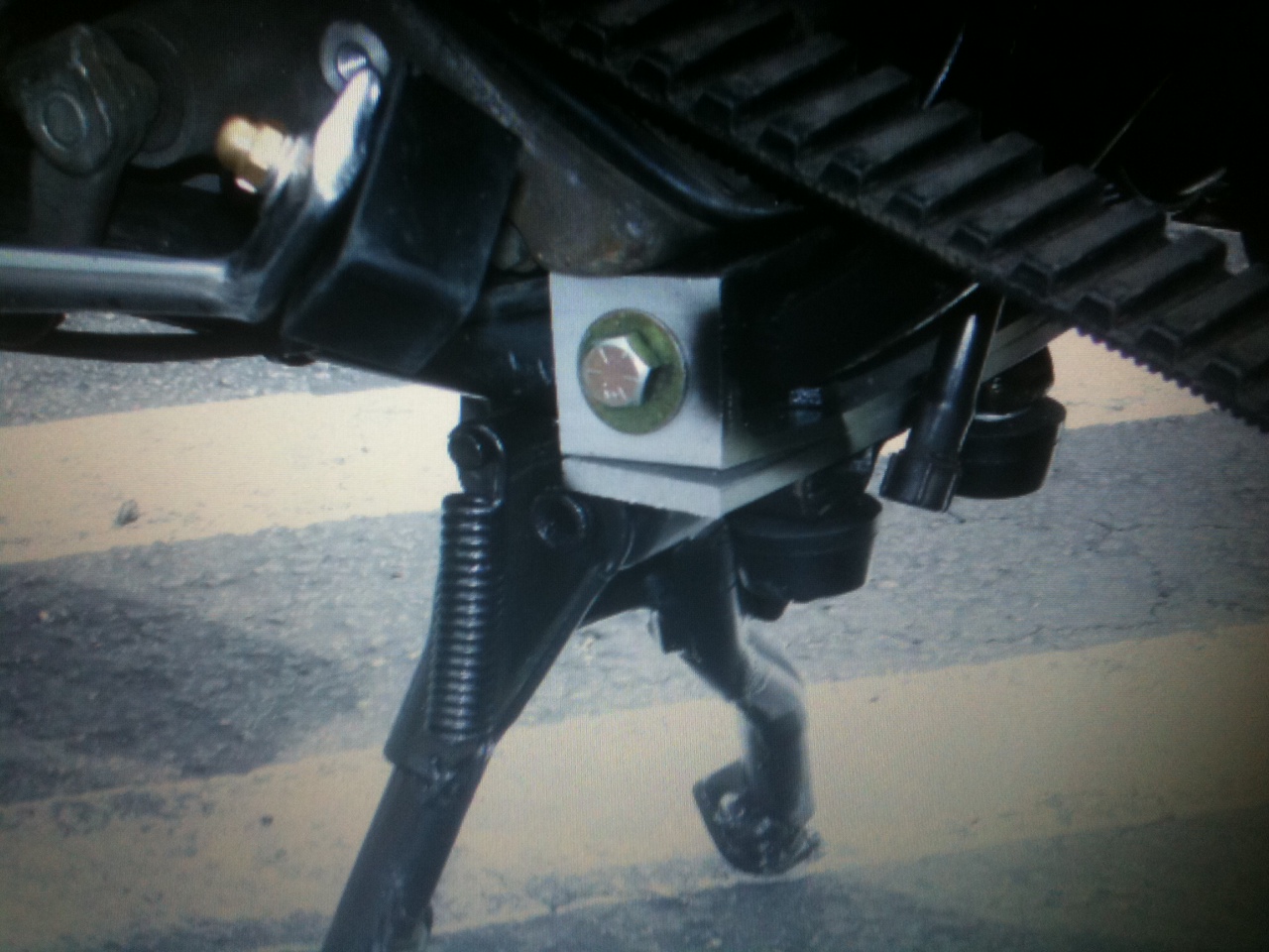 Well, What you can see in the pics is a center stand from an small scooter that I found in a junk yard , I cut some corners of the base stand in order to make it lighter and to fit better below the engine; I use the Bolt (10x180) #23 in the Crankcase schematic diagram as a stand shaft( used one from the same size but 1/2 longer), then I cut a piece 7 inches long from a 1/4 aluminum angular , and everything fit tight perfectly. Pardom for my english , I am a Cuban rafter.