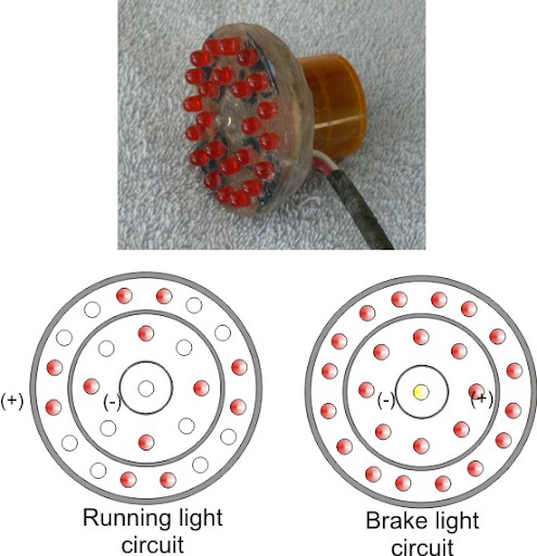 On the brake circuit each light has 24 high output red LED's and one super bright white bulb.