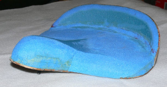 I made the seat pan from 3\16th plywood with a couple of layers of fiberglass top and bottom. The plywood/fiberglass seat has a simple curve front to back. The foam is cut from a five dollar exercise mat I got at Walmarts. The foam is several layers of 1/2 inch thick high density foam glued together with 3M contact cement. I have two layers in the back and up to five in the seat horn. Shaping is acually very simple. I used a short Surform (cheese grater) rasp and a flapwheel sander drum attached to my dremel tool. If you screw it up, reach for more glue and foam! My final foam thickness ( at this time ) is about 5/8 inch at the back and gets thicker as you move forward.