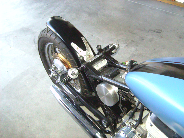 My rear fender is mounted via a left-over 1970s Jammer headlight mounting bracket. And it WILL pivot in the mount if I don't have a support from the exhaust tip to the muffler (VN800 reflector bracket for now). It will be a moving fender (think Kawasaki Drifters) later this spring... Of course, I run a full fender (FLH, Shovelhead era). And a seat based on the stock pan.
