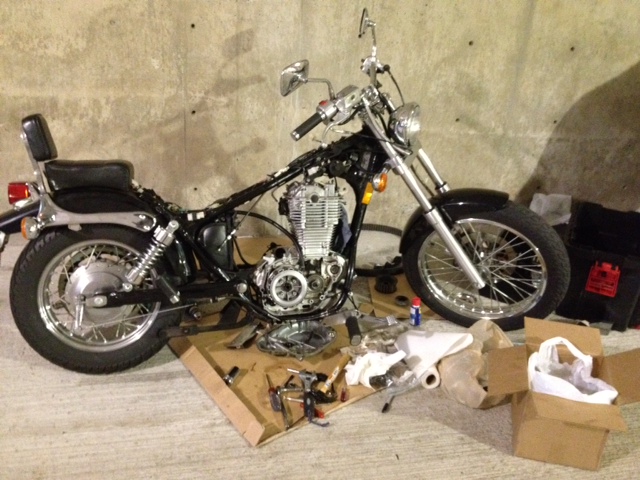 It's all coming along, thank god for Clymers. Got it ready to dismount. It was a pregnant dog getting some old phillips screws out and unflattening those washers, not to mention getting the belt nut off. Crescent wrenches prevailed, however. Head/cylinder off Monday to see what's in there... A savage buddy also suggested taking the bottom end into the local Suzuki dealer to see if they think the bearings are okay, since we never determined the cause of the loud knock.