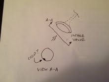 I got the boroscope in the sparkplug hole, amazing technology. Cylinder looks good, I can see the arrow on it and I can see the arrow on the piston top. Piston top is clean and shiny except one big quarter size looking spot of oily carbon gunk. But, one intake valve looks like it has a little chip out of the edge. Exhaust valves are white, lean? Intake valves look black and sooty. Waiting to hear from a friend tomorrow to confirm if I'm seeing a chunky off the valve, but, otherwise it looks like time to yank the motor... Any thoughts are appreciated. See my sketch below haha.