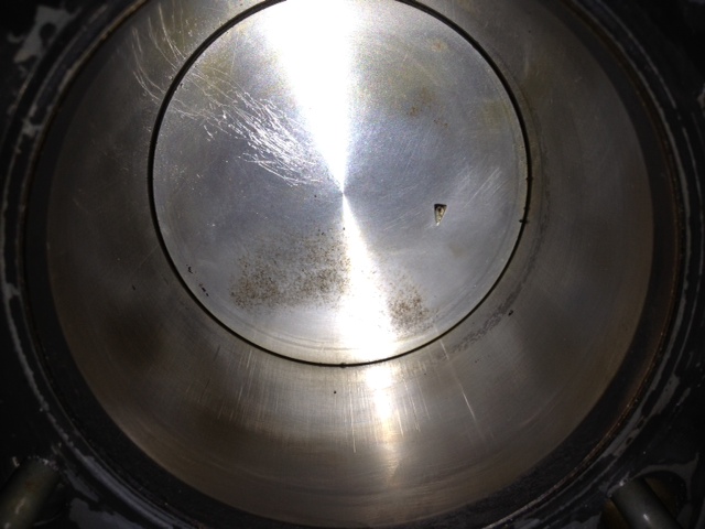 Okay, cylinder off and no catastrophic carnage.  The boroscope was wrong, no burnt valve.  Only thing I can see is some piston top scratches from my screwdriver while checking TDC and some slight discoloration on the RH exhaust valve.  However, I noticed the rod is has a wee bit of side to side play on the crank.  Being a teardown newb, I have no idea if this is normal or not.  I assume it could be the source of my knocking, but, there also must be a hair of play there just from the pounding it takes.  Bottom end guys, let me know what you think.  You can see the pics below, they don't show much.  A hair of scoring on the cylinder, but, I assume that's normal, no major gouging.  It's either roll the dice and re-ring and hone, or buy a 2nd hand motor.  What's the call, I'm all for getting this project on the road, maybe having a spare motor isn't all that bad.  I'm just dreading putting a used motor in and hearing the same thing.  You'd see a grown man cry :'(.