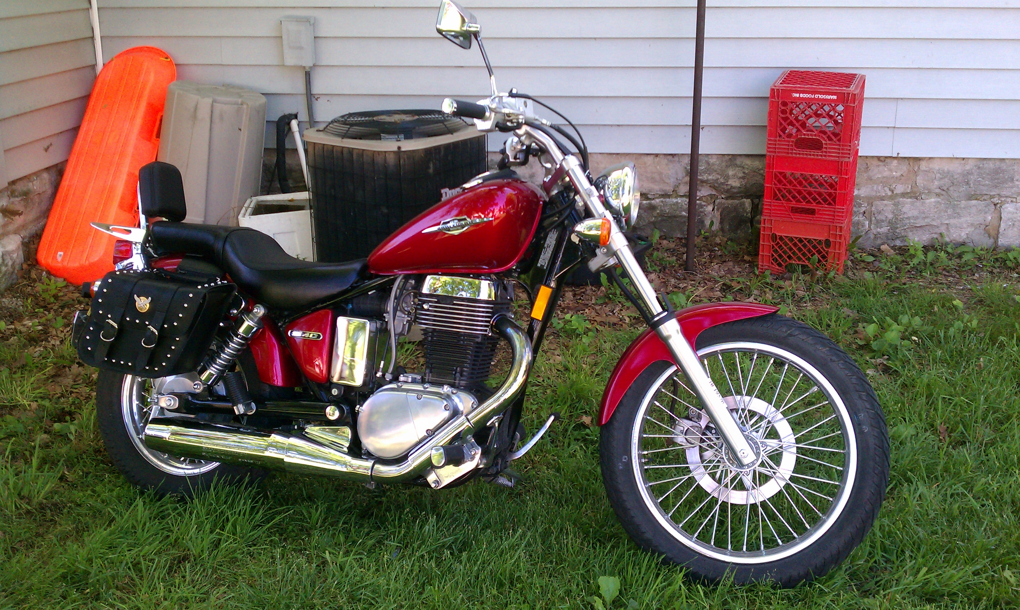 2007 ls650 s40, Ruby Red, Nighttrain muffler, pod air filter, 155 main, chain conversion, superbrace fork brace, vista cruise cruise control, and a helluva lotta fun