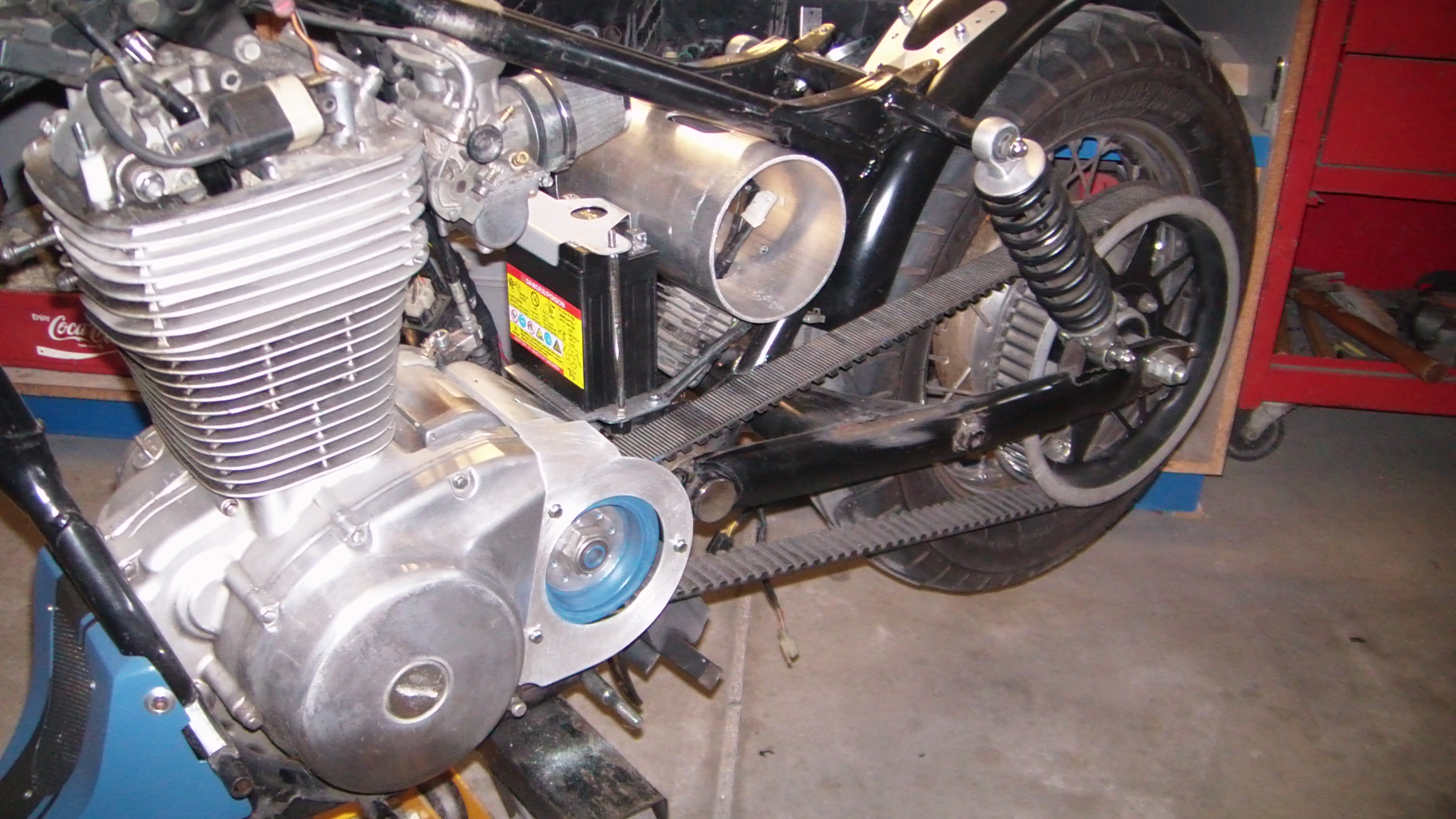 I'm with Ya on painting the fender blue, that would look good with a black seat. Painting some blue on the rear pulley might be to much.
