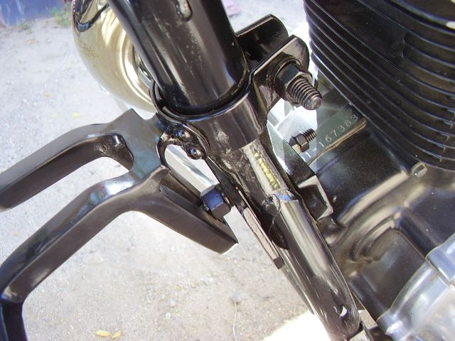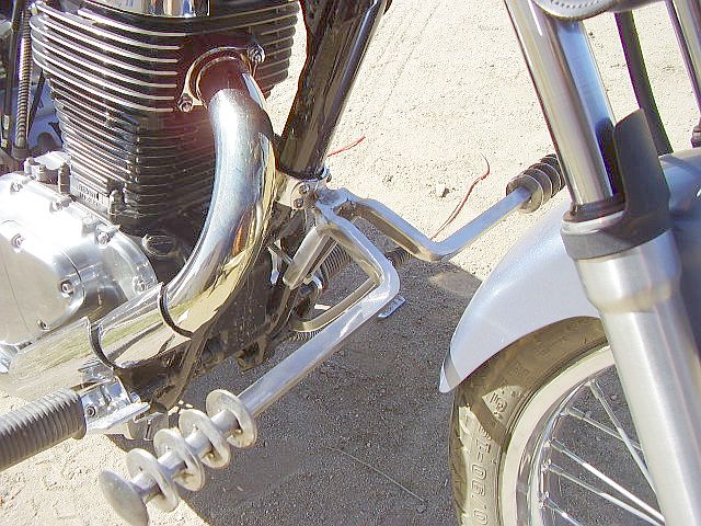 decided to fabricate some "highway pegs" to have an optional foot rest for those long cruises, iam using 5/8 x5/8 solid stock, will attach to the single downtube with a heavy clamp at the top and a 3/8 bolt  with a back up plate behind the split at the lower downtube, the foot rest area actually ends up about  9" forward of the stock peg and 9" above, when its all fabricated I will seek out a chrome shop and send it in with hardware for chrome plate, I will post new pics when its all completed Smiley