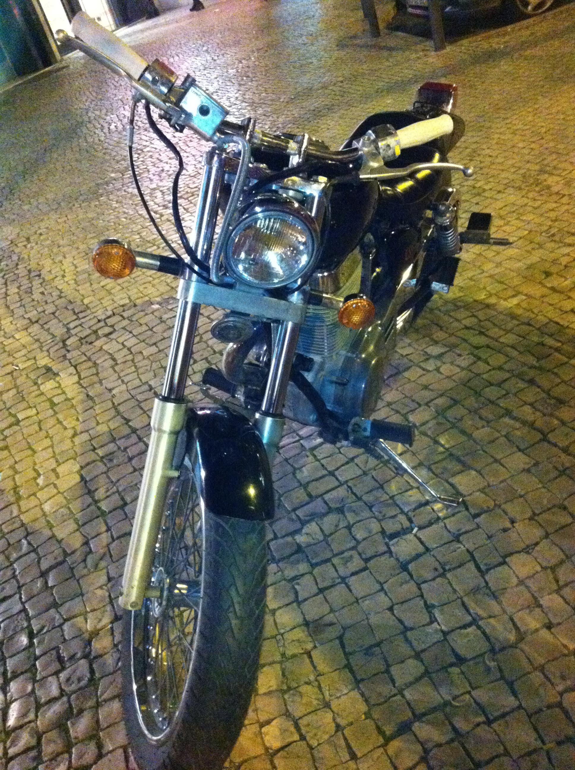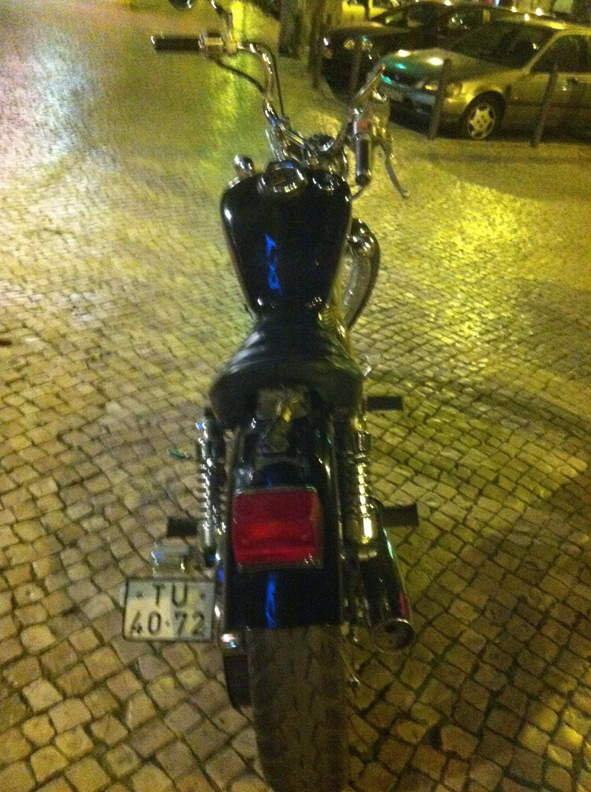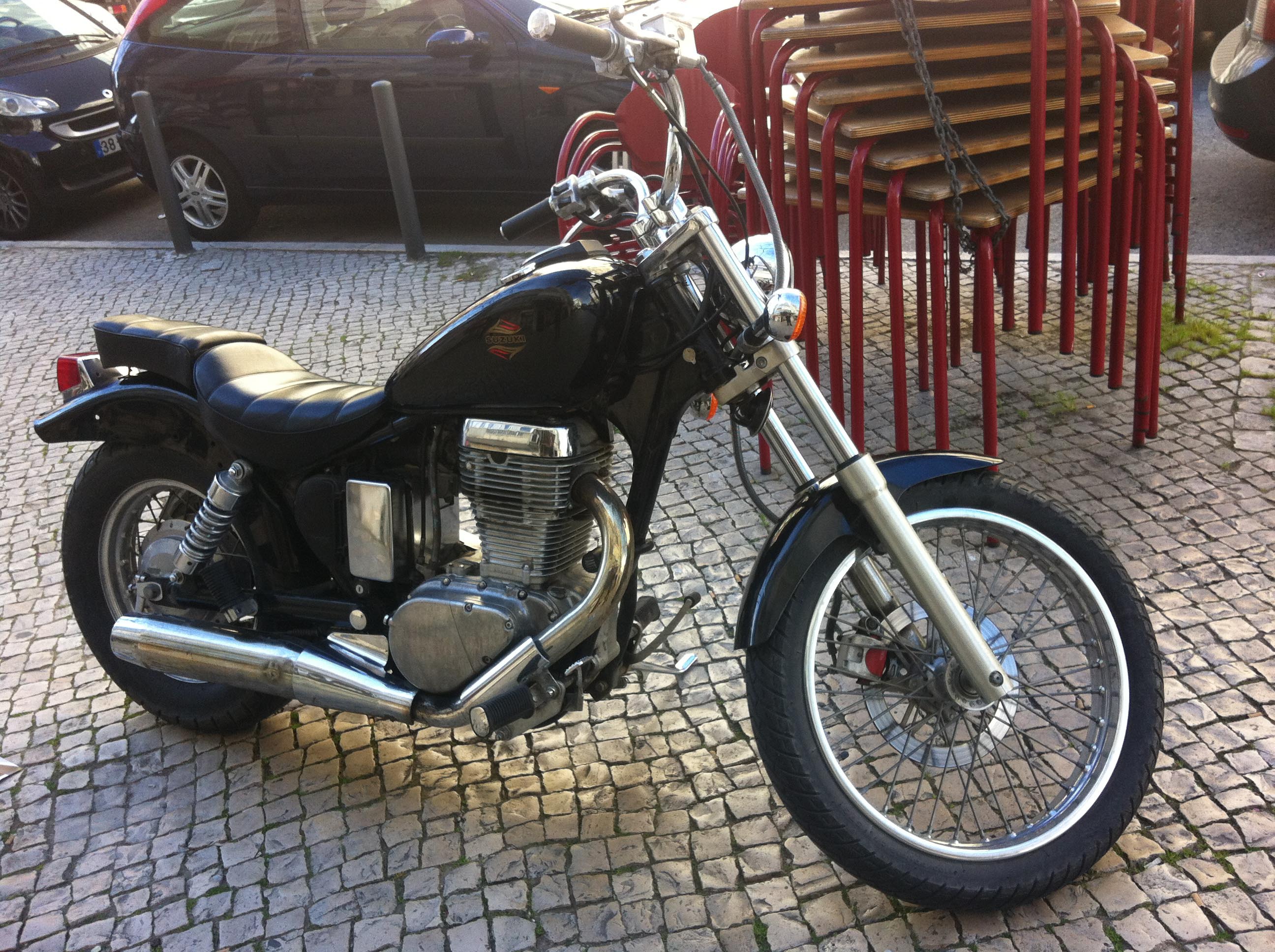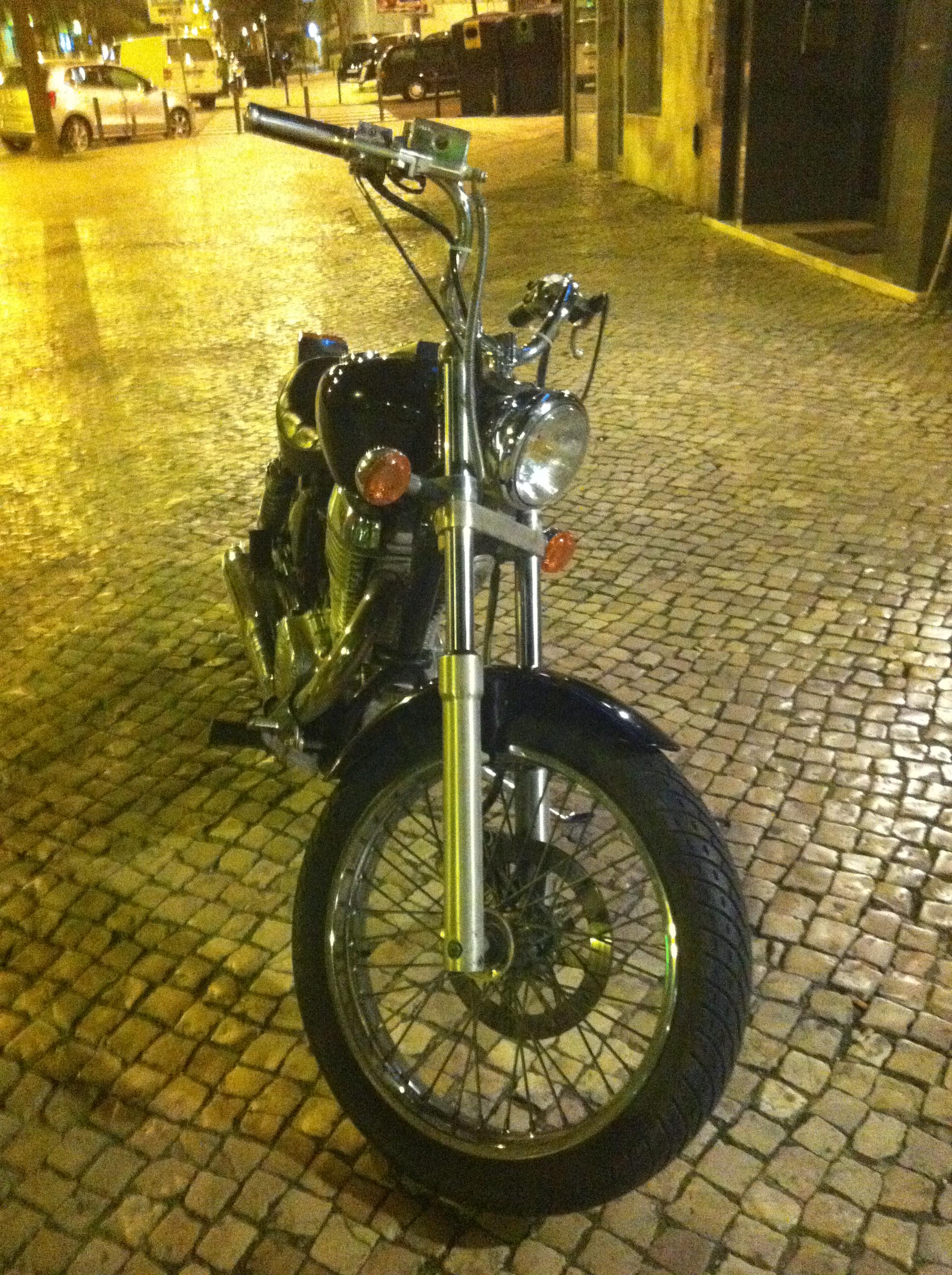 Next step...... change the handlebars. I bought a used HD dragbar and mounted it, unfortunatelly because it's a litle bit curved I don't have stearing clearance, so, I had to leave it facing up. It looks bad, but at least it can be riden. Need a solution for this, any sugestions?