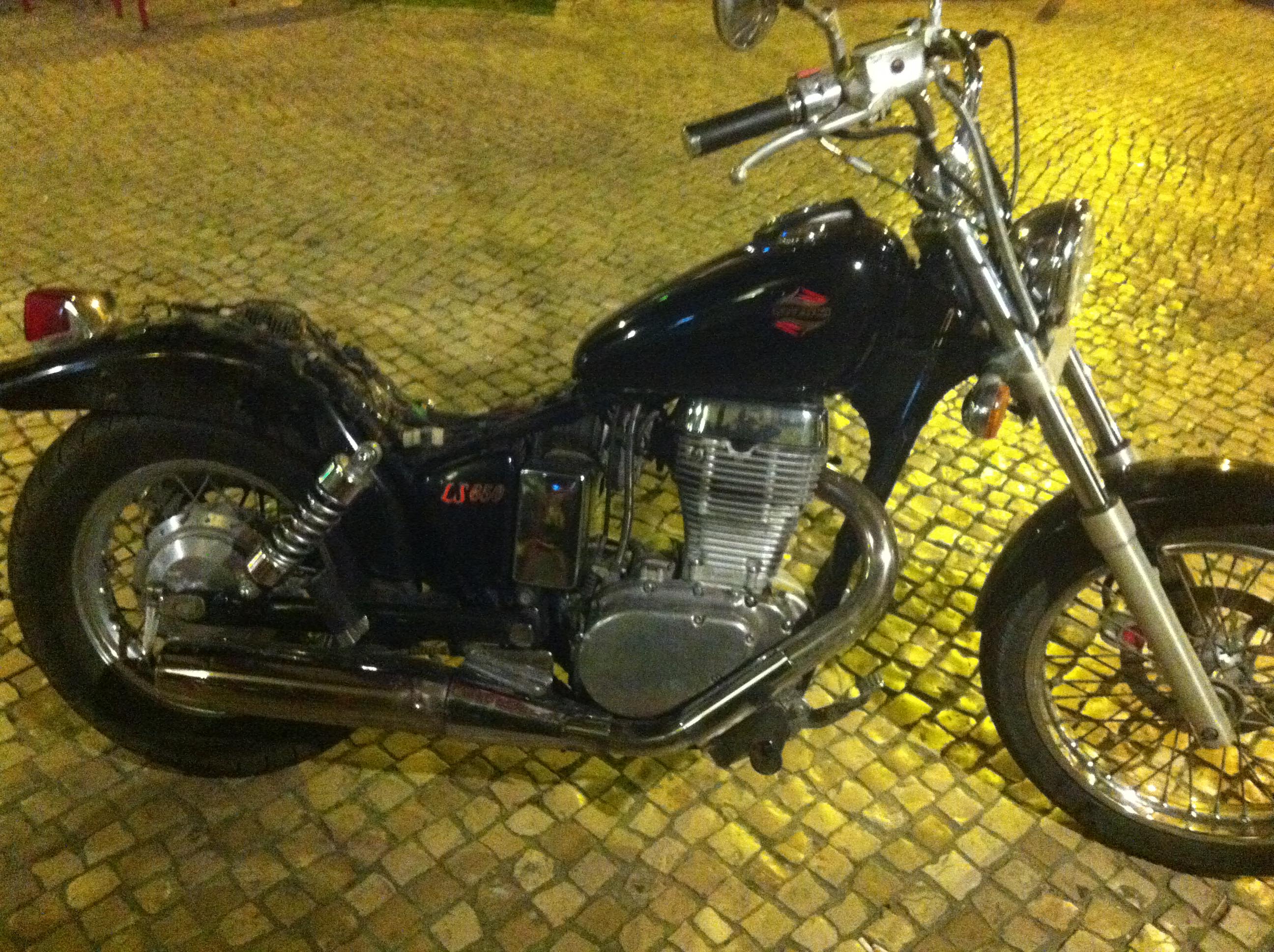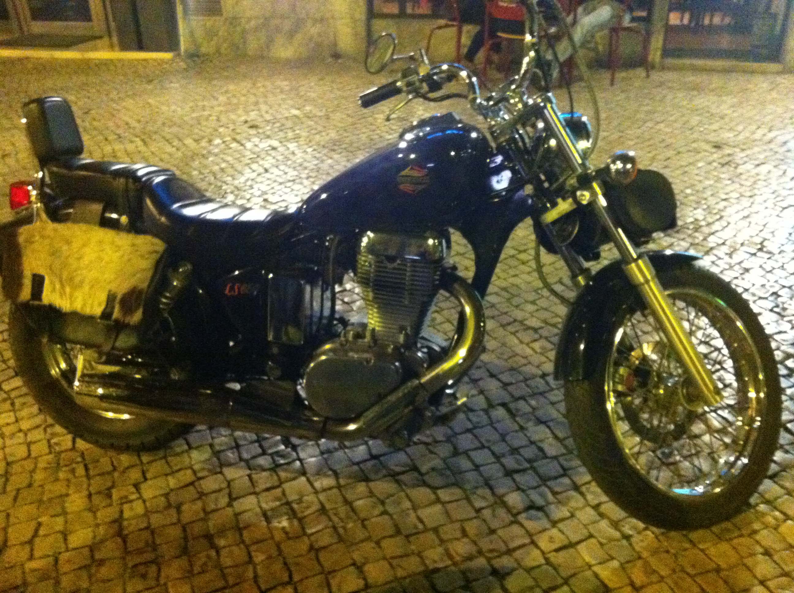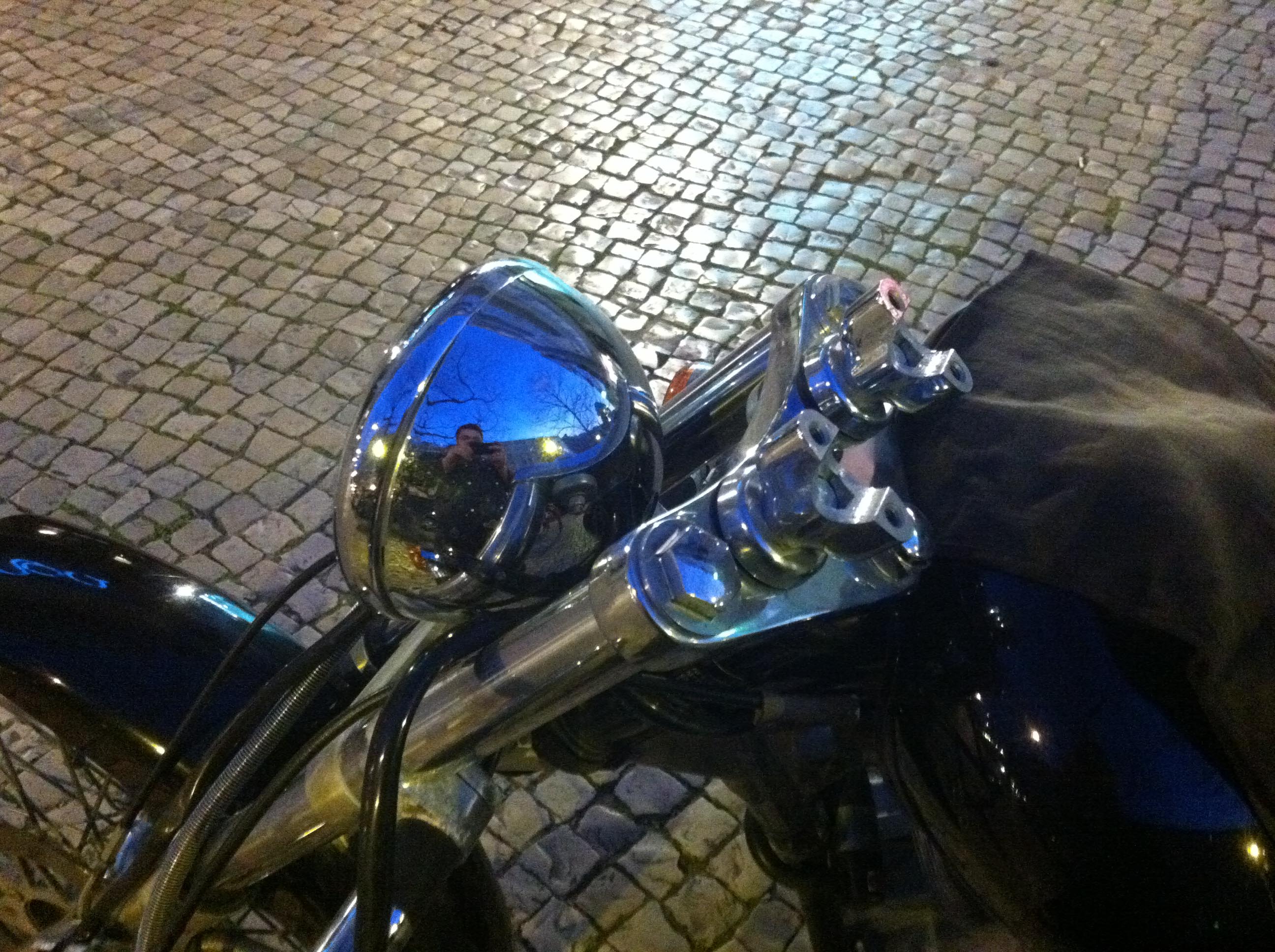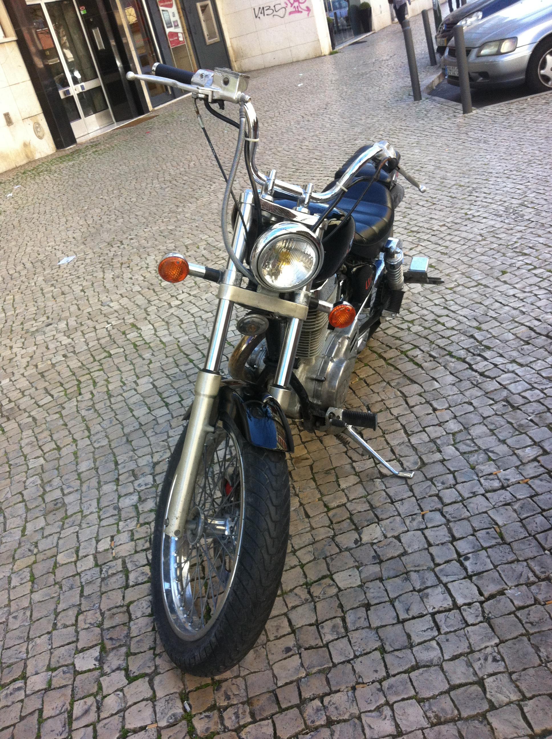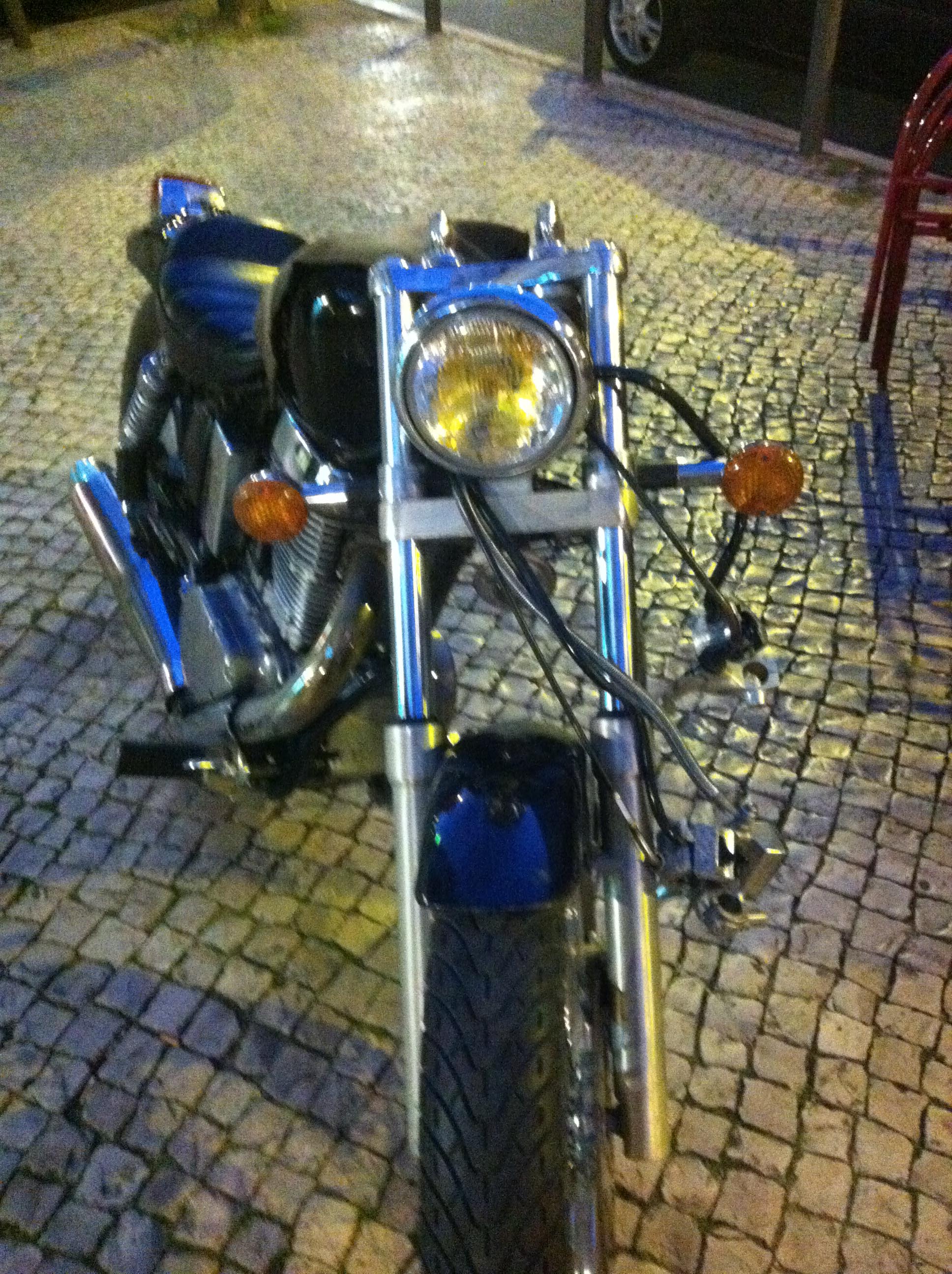 Next step...... change the handlebars. I bought a used HD dragbar and mounted it, unfortunatelly because it's a litle bit curved I don't have stearing clearance, so, I had to leave it facing up. It looks bad, but at least it can be riden. Need a solution for this, any sugestions?