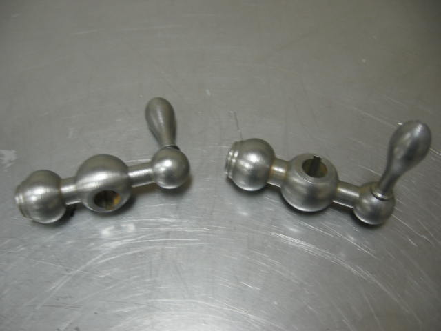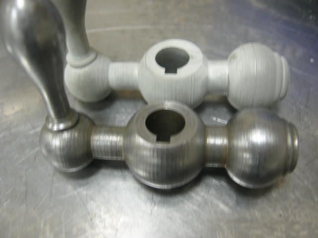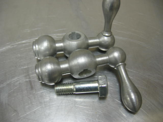 And this is what the plated handles look like after spraying with a clear coat. I have also included a bolt that I had barrel plated in the picture. The Eastwood plated handles end up being a little hazy and gray colored compared to the professional plated bolt. It took about an hour of labor to plate these 2 handles......too much time if you have a number of pieces to do. Removing the rust and corrosion is very time consuming - if there is any trace or speck of rust it will not plate over the rust.