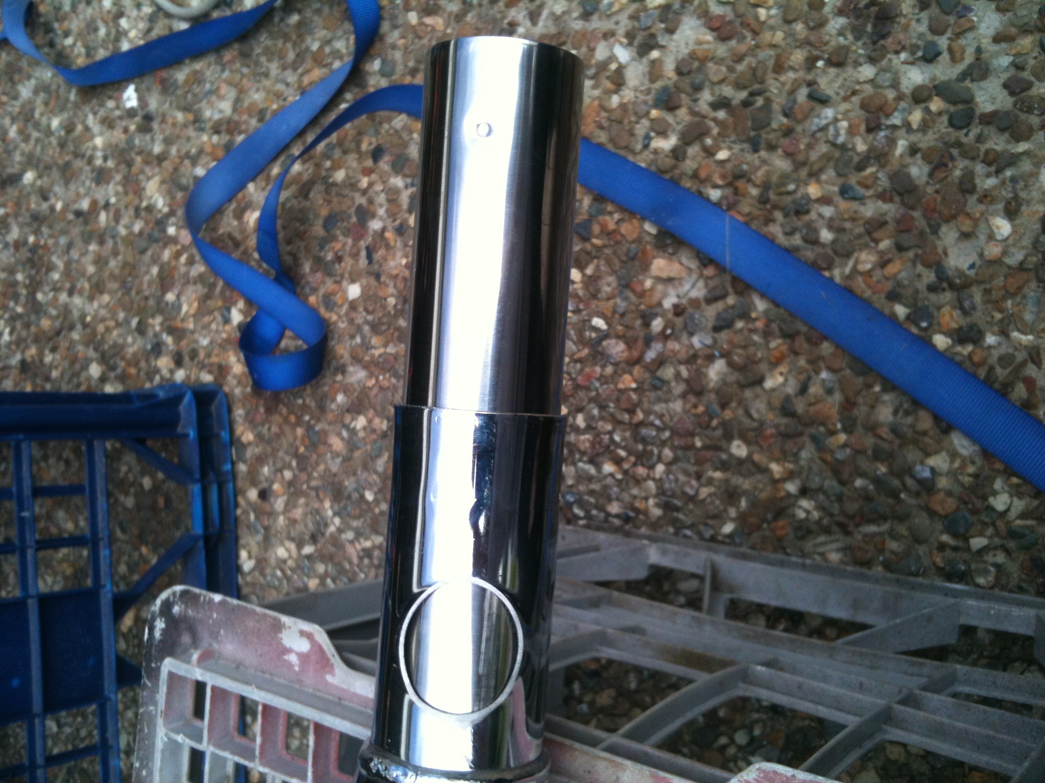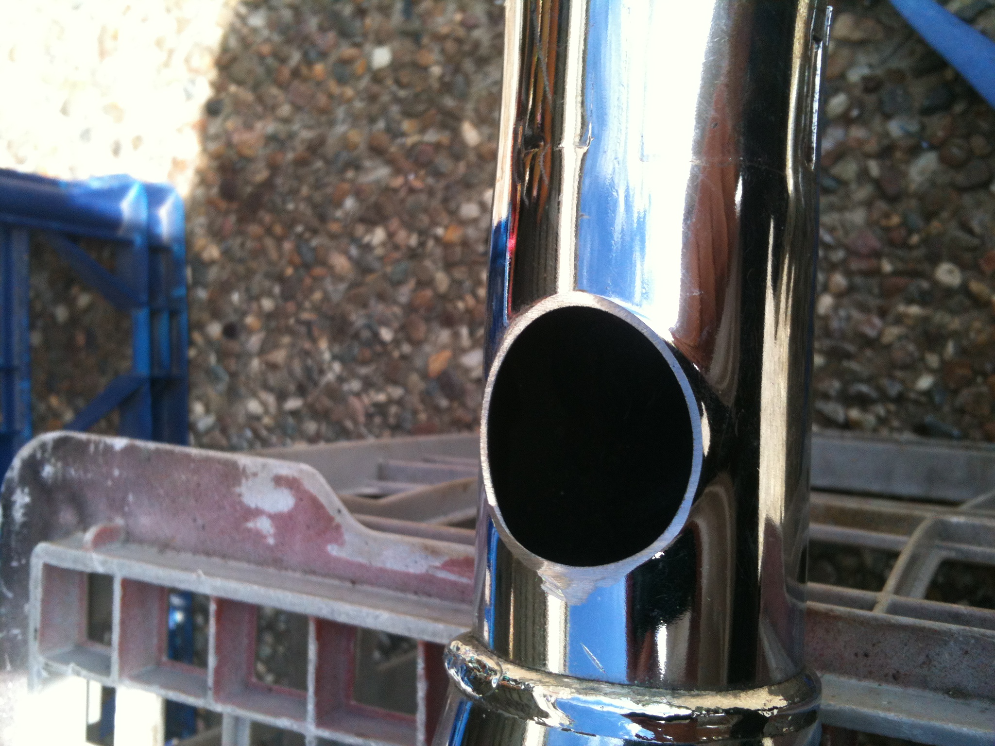 Step 2. I measured the internal muffler size 44.3 mm and external header pipe size 42.1mm exactly then off i go to the local auto store and pick up a stainless steel car tailpipe tip. Take your verniers as of the ten of the "same size" they were all slightly different and i measured each one to get the best size for what i wanted. ie extreamly tight fit. (The 17 year old shop assistant was very confused with me as to why .2 to .3 of a mm was so inportant) i ended up with 44.6 mm and 42.5 mm.