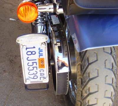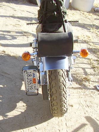 well to answer some questions, the top portion is were the 5" x 1 1/4" oval LED will mount when it gets here, the lower is just the way it worked out, thought it looked cool as a guard type thing, if the axle bolt loosens up the least of my worrys is the license plate