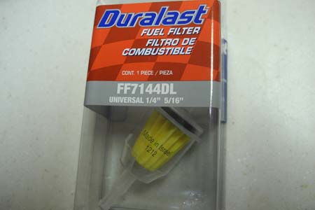 My third test was the Briggs & Stratton filter. I did as in the second test. I held my finger over the outlet, filled the tank, unblocked the outlet and started the stopwatch. This time flow started, albeit slowly. Then apparently an air bubble exited and flow sped up to normal, taking a total of 88 seconds to empty the tank. The filter never filled with gasoline. No photo attached of this one, as it is the same as the last time. Last time when I "primed" the filter it took 74 seconds. I think the difference is the slow flow until an air bubble exited.