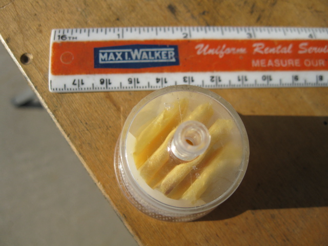 As a final and very unscientific test, I blew through each of the filters. There was no noticeable difference when blowing from inlet to outlet or from outlet to inlet, so apparently there is no one-way valve. But the Briggs filter seemed least restrictive, followed by the last filter, and the first one (TW FASTEX VISU FILTER) was noticeably more restrictive. These differences can be attributed to filter media area or to filter restrictiveness (micron filtration) or both. I have no way to know.