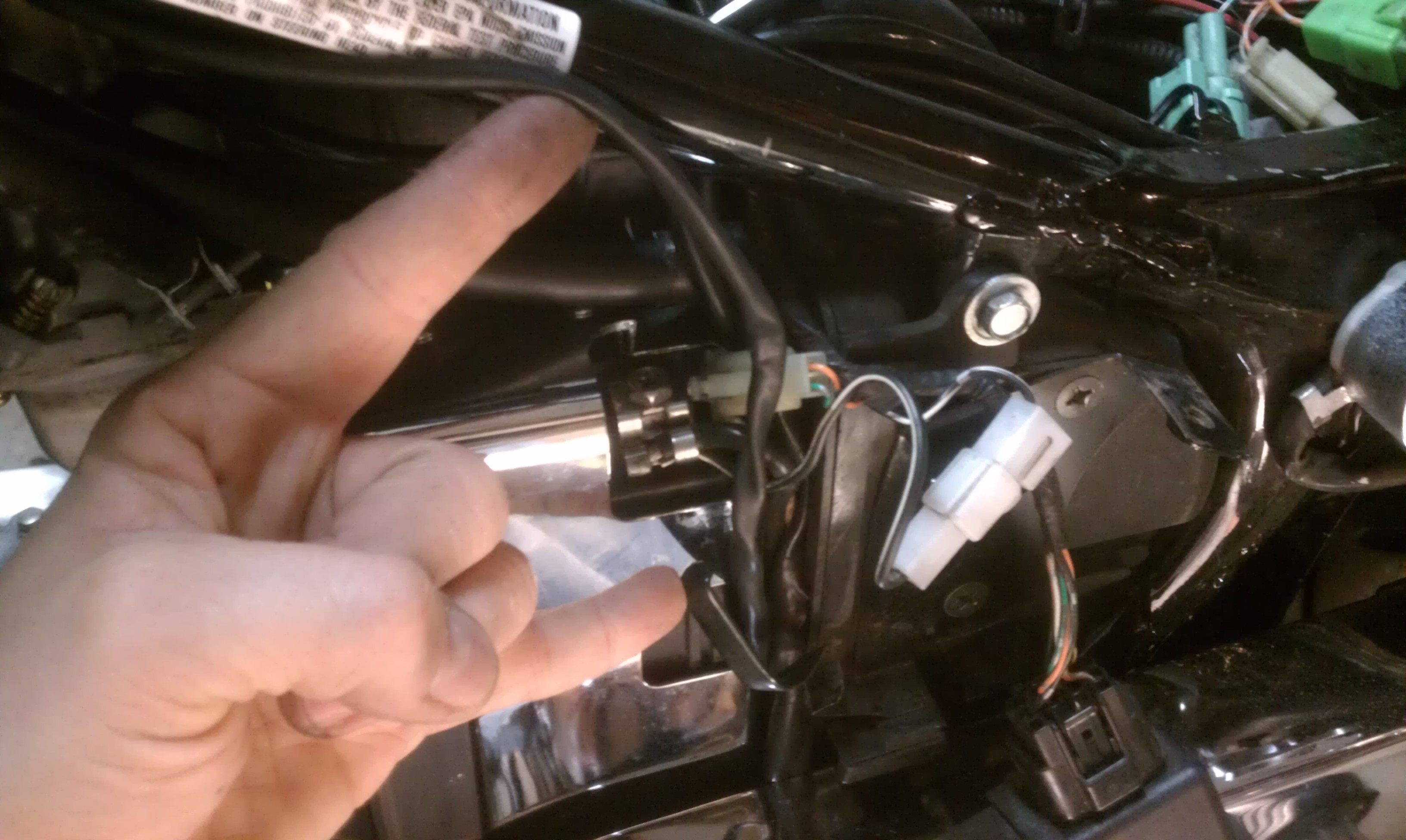 The neutral indicator wire comes out of the gearbox, and seems like it should pass into the clip that's nearby. But if I put the wire through that clip (see first pic), it will a) hold it real close (or against) the hot engine body and b) be a really tight stretch under the frame, up along the battery and along the upper frame to where it meets under the tank (see second pic...index points to wire, pinky points to clip where it maybe should go?). Or maybe I screwed something up? Can anyone tell me if I'm off base?