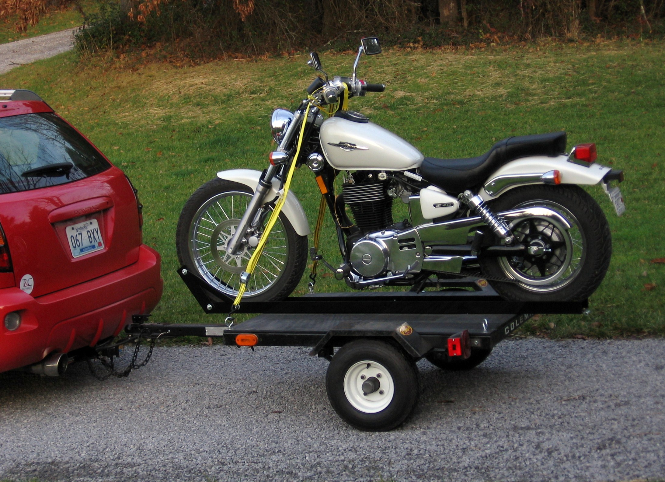 IDK hoot about that particular make/model. Ive seen stuff like that goin down the road, no drama/.I have a hard time seeing myself poke a square pipe in another square pipe & run a pin thru it & then run my bike up on it & go drive around, but, if I had to, I guess I would. TRailers can be had for little $$ at Harbor Freight. Get the kit, build it. Its a small cargo hauler or a bike hauler, or both. Put tie downs in the floor & Violins ,, ya got it..,They sell tie downs, too, IIRC. I know Ive got some in mine, Get to diggin in the plywood stack at Lowes. I found some 3/4 Oak ply that was scraped up & got it 50% off.