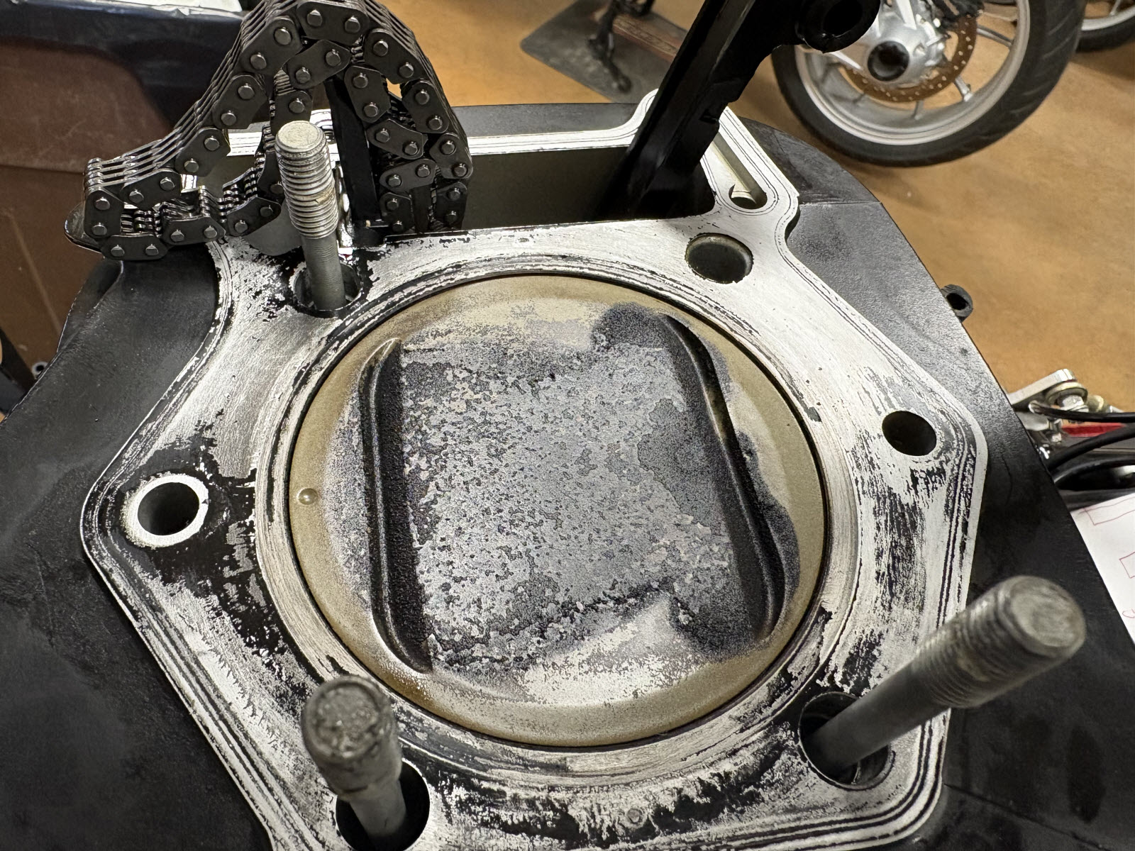 The top of the piston with 500 miles of break in oil and a somewhat easy riding with limited full throttle use (no extended speed runs). However I did ride at 60-70 mph a few times.