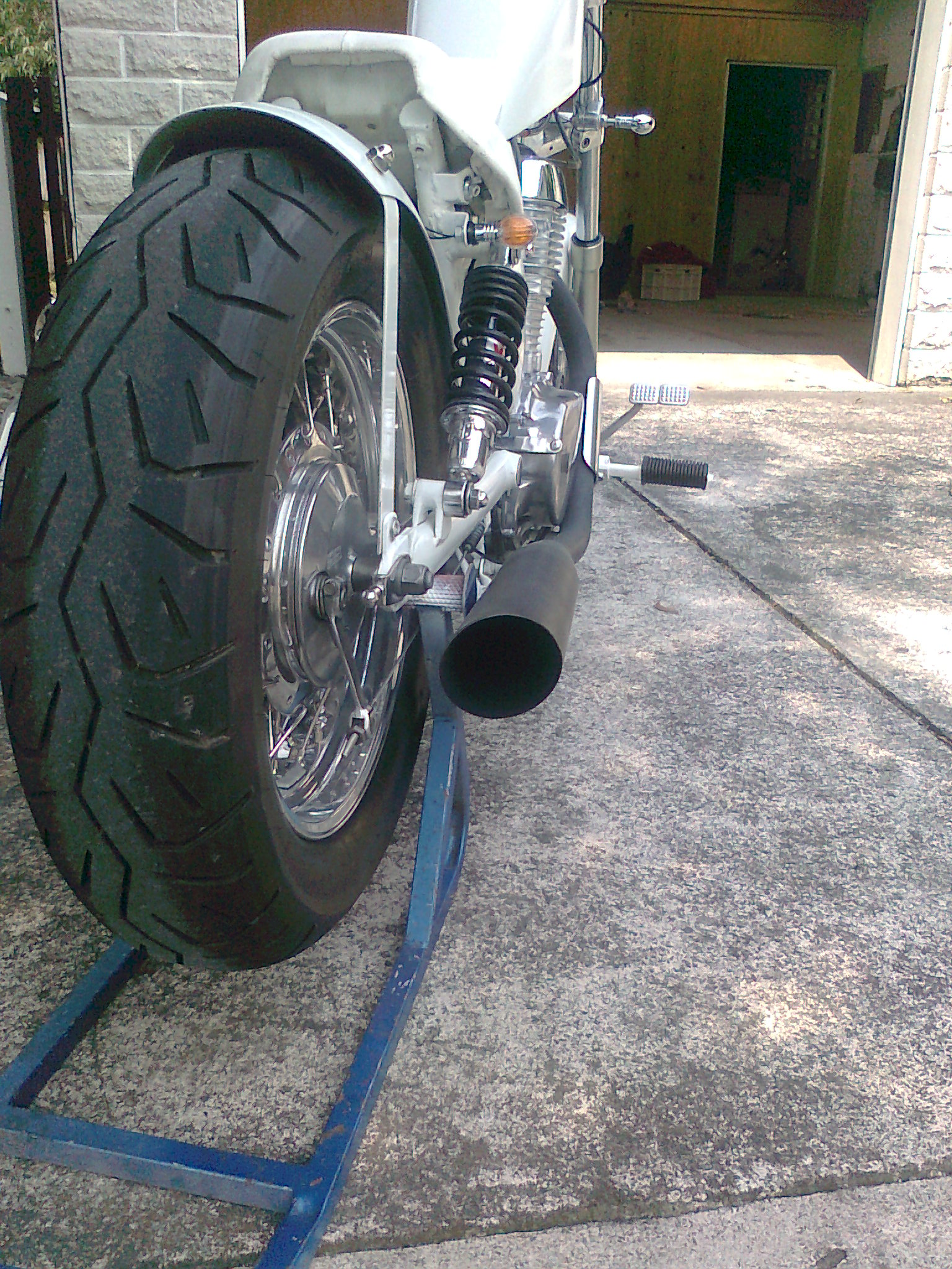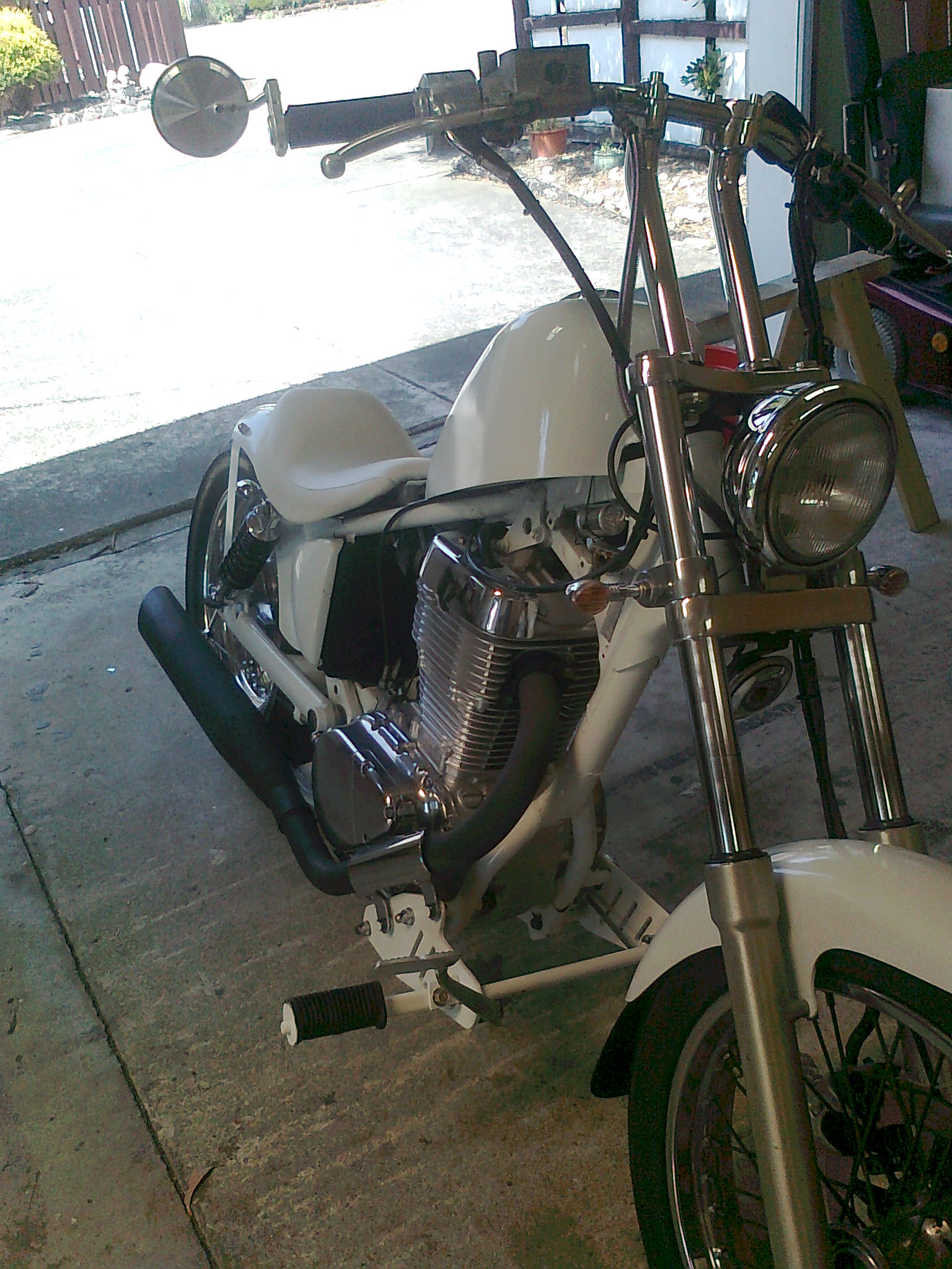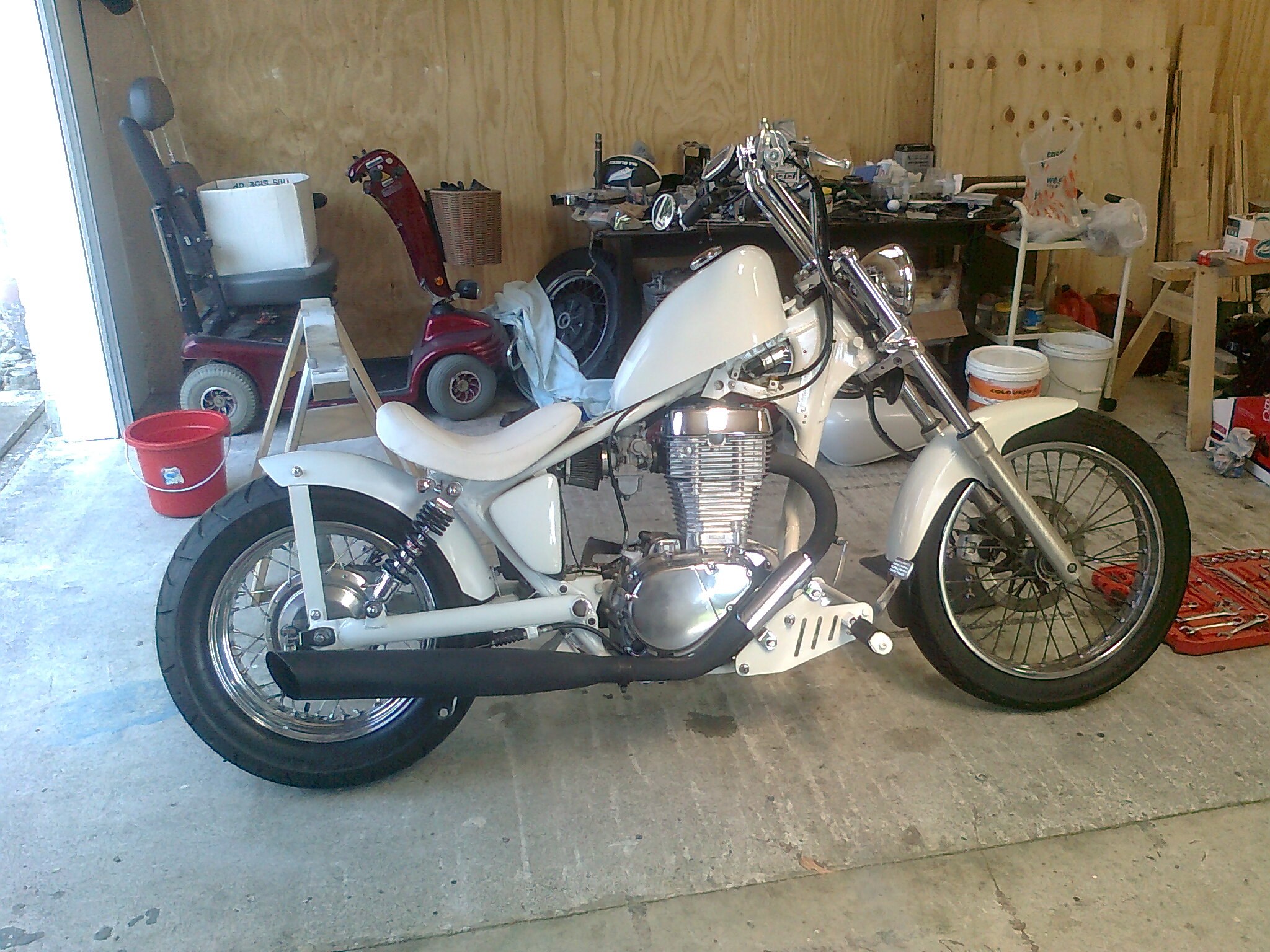 Nicely done! Is that the stock exhaust pipe? Where did you get that muffler looks great...the flat black goes very well with that bright white paint.