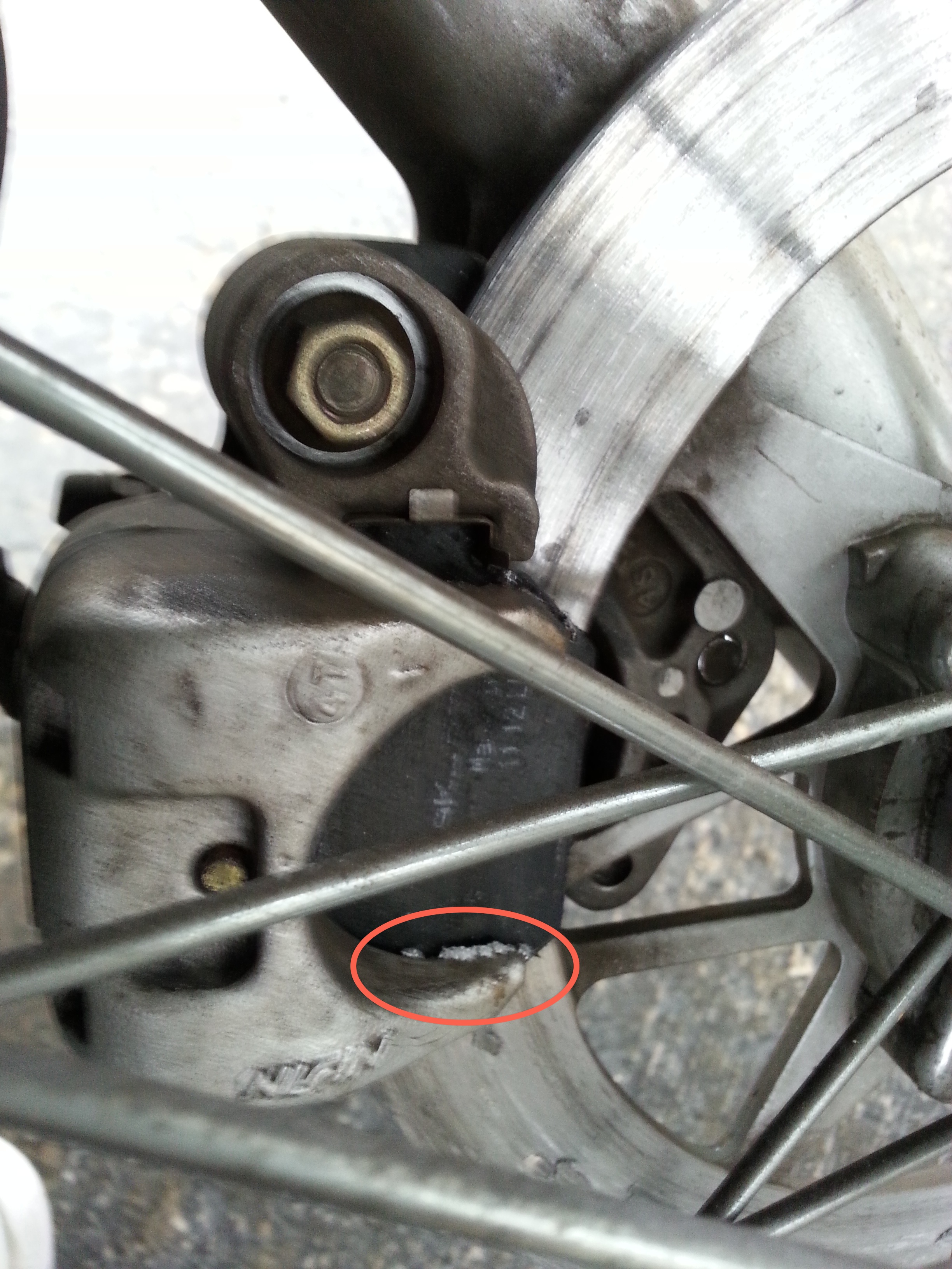 Here's another photo where you can see the part of the caliper that was rubbing against the rotor.