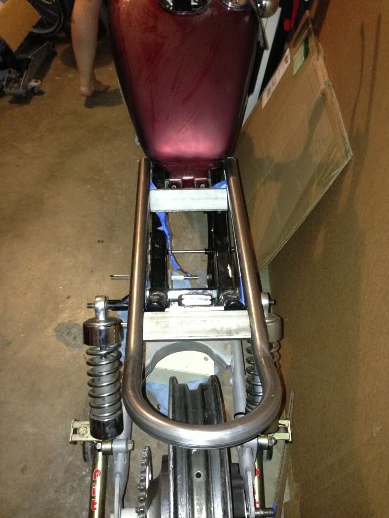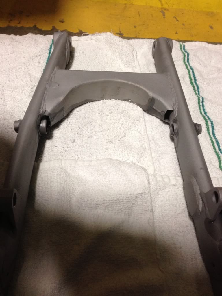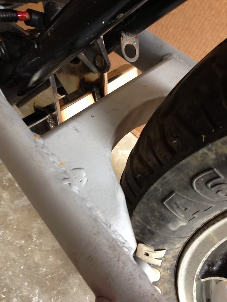 Finished swing arm mods, tonight. Got the divot out of the cross brace & a piece of sheet metal welded in. Looks pretty good. Here's a bad pic, more to follow.