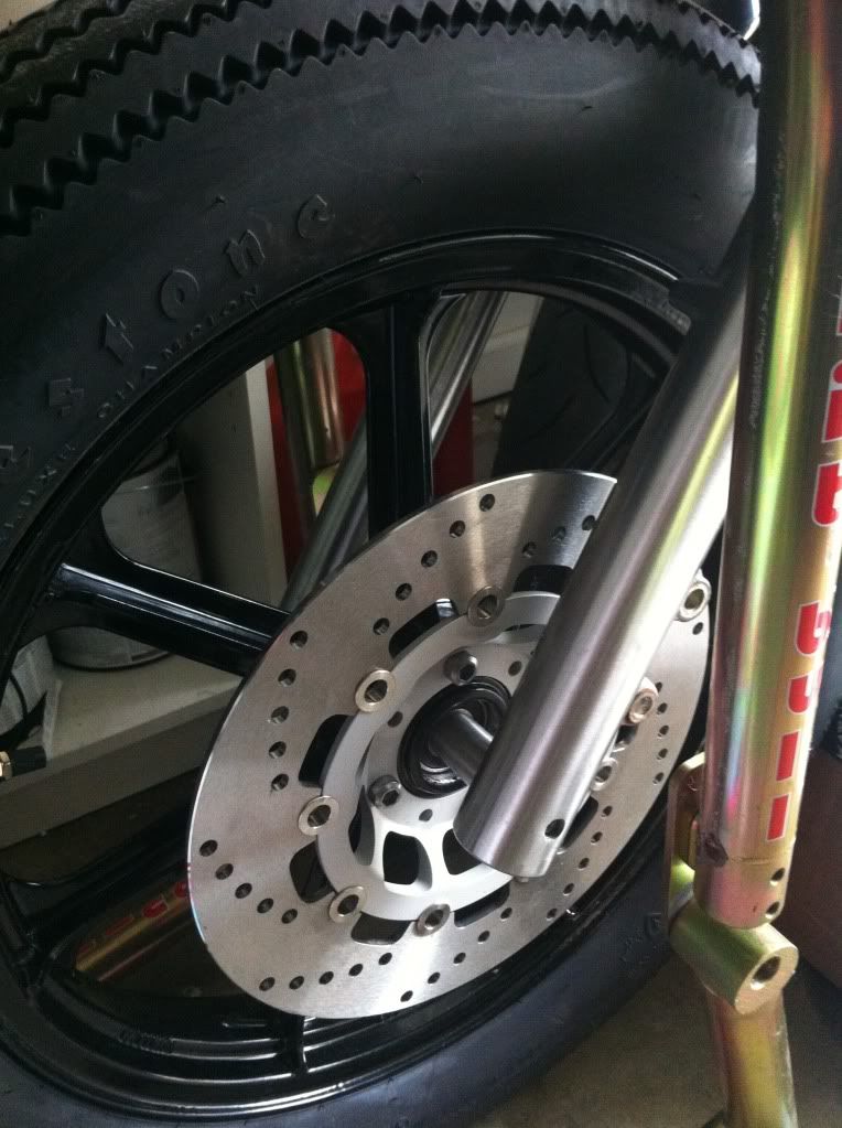 after my boxes (and boxes!) arrive, all that should be left is a seat covering, and paint. I fabbed up a plate to weld over the obnoxious "glory hole" that Suzuki calls "gauge placement", and that should happen this week. I'm really contemplating a replacement bung and screw in cap. I went with an RFID ignition, and a simple screw on cap would allow me to be keyless. (so that could be something else I order!) The last part I should have to fab is my brake offset arm. The KZ wheel runs a significantly larger rotor, so I'll have to make the bracket grow. That might change over the winter, as well...... I have ideas of a beautiful Brembo hanging from the front end, or possibly a replacement front end all together. I really feel that the front end is the real limiting factor in many aspects with this platform. You cant replace the tubes with a like diameter, you cant drop the front end, theres no adjustment, and with no true pinch on the top triple clamp, theres a lot of twisting going on there. add rubber mounted bars, and the front end feels like spaghetti!