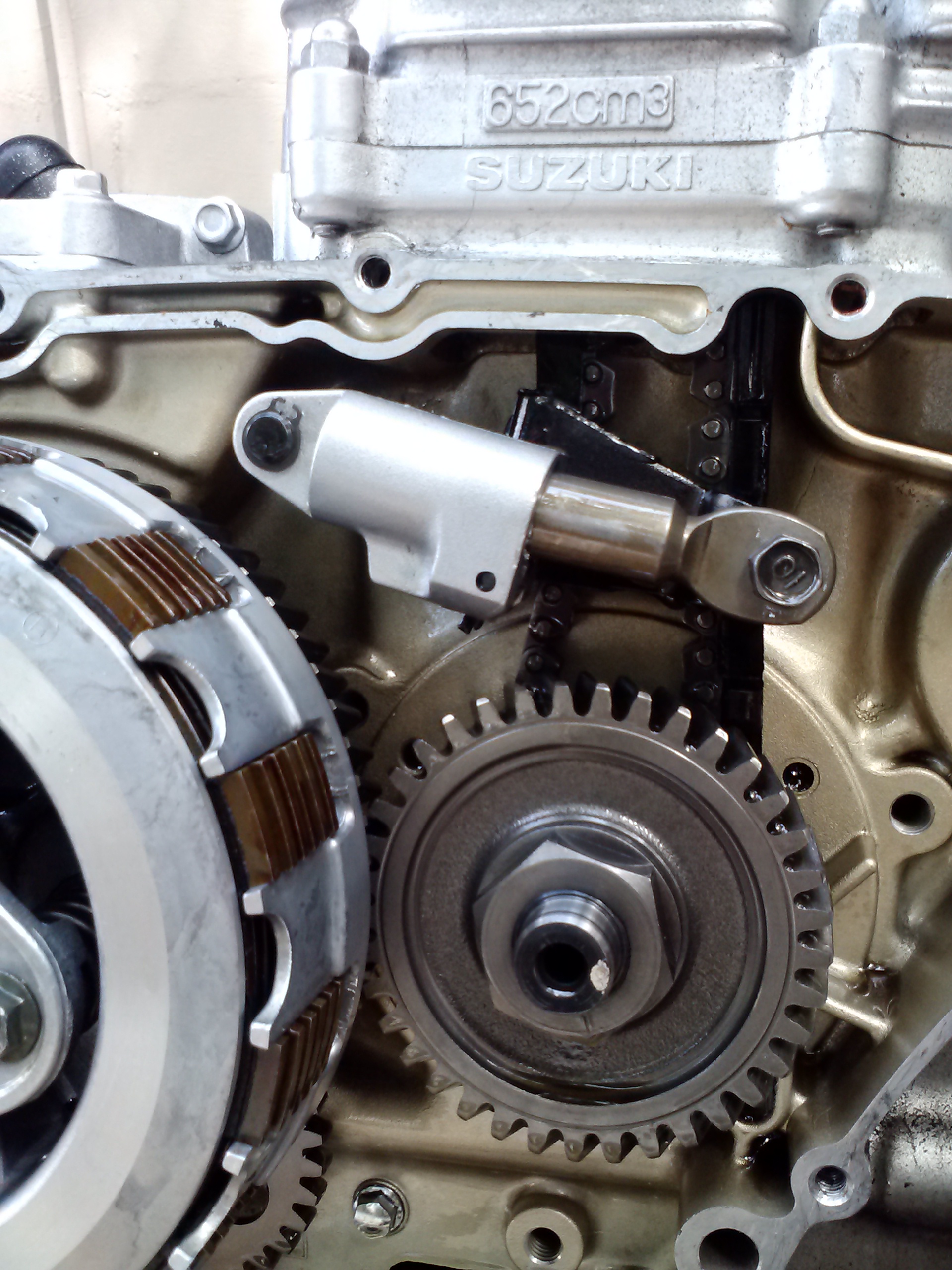 Im also checking the cam chain which appears to be in great shape. Not really sure about the slack. The right side is completely vertical which i read was good and the left side is well.....heres a picture of the old tensioner which is now off and going to be shipped to verslagen for a verslavy specialty