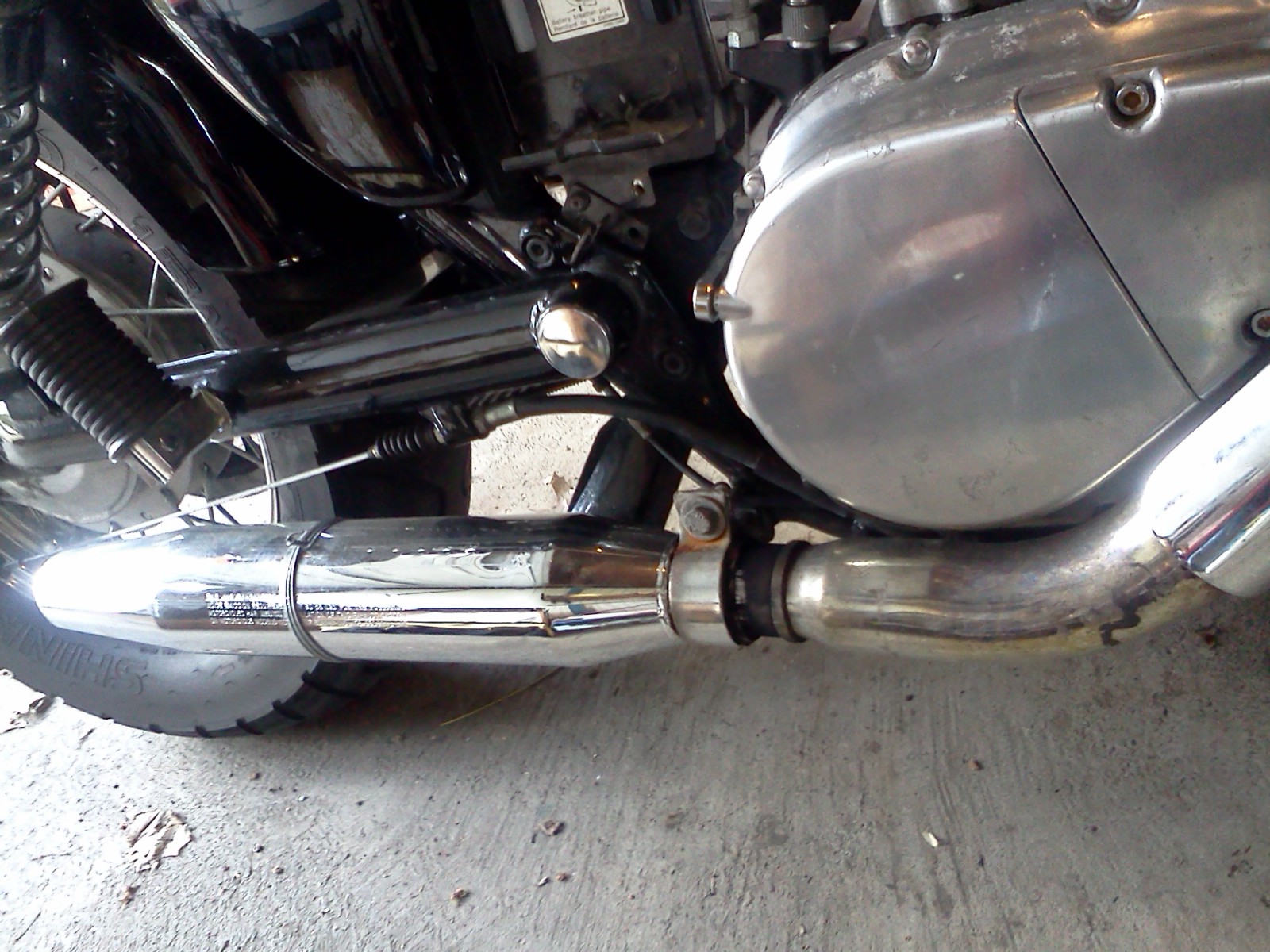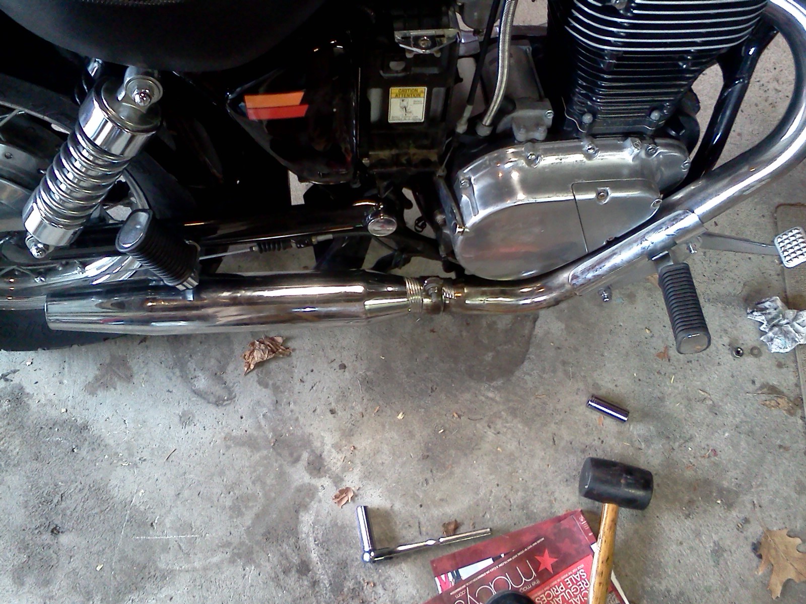 When I bought this (my first) bike, I didn't happen to look at the exhaust itself. The bike started up, sounded to me like it ran okay, had everything it needed to pass NYS inspection, so I picked it up for more than I care to share. Upon closer inspection, I found that someone modified a harley sportster exhaust by cramming it full of steel wool and bending the mount so that it would fit the frame.