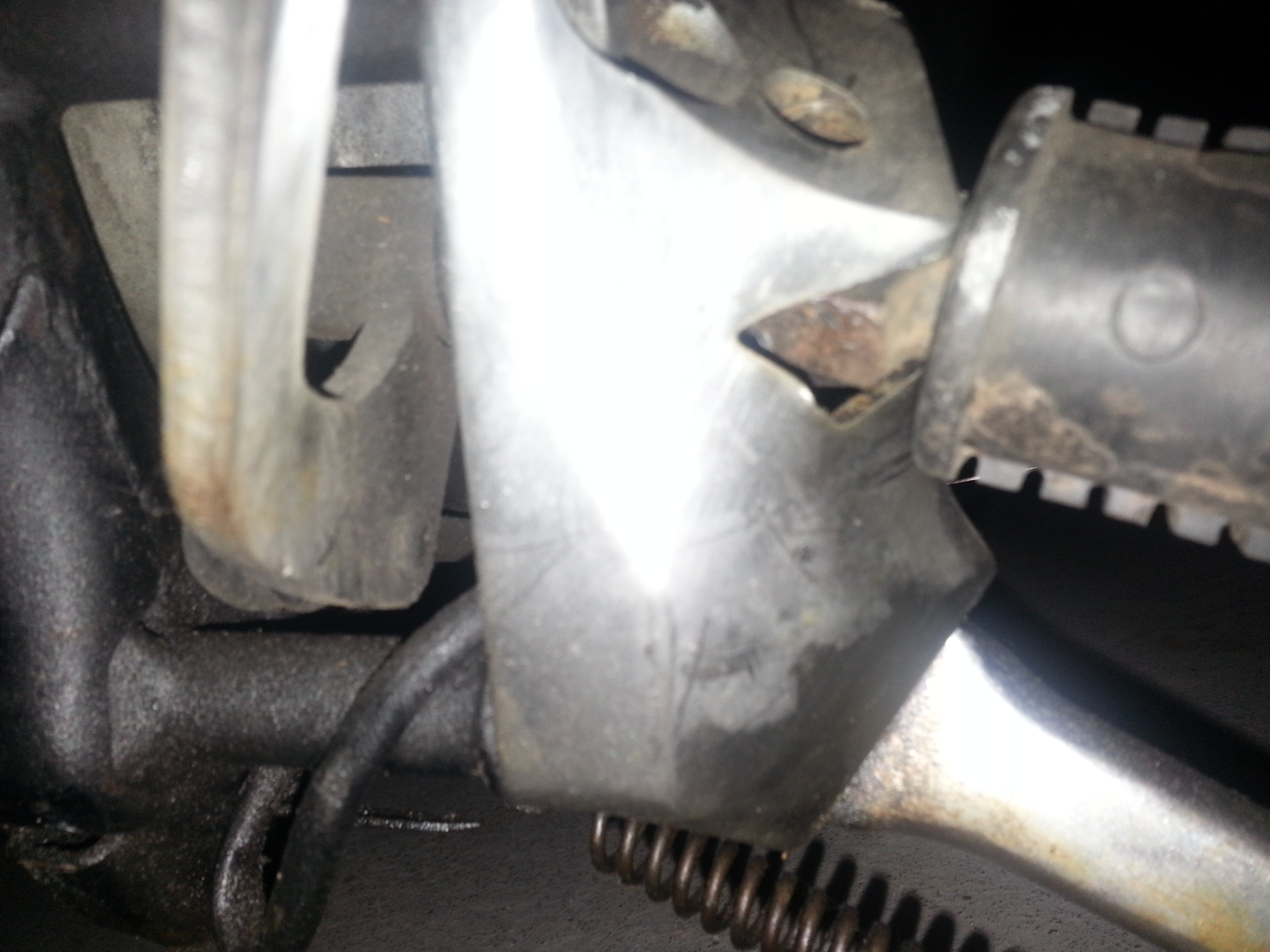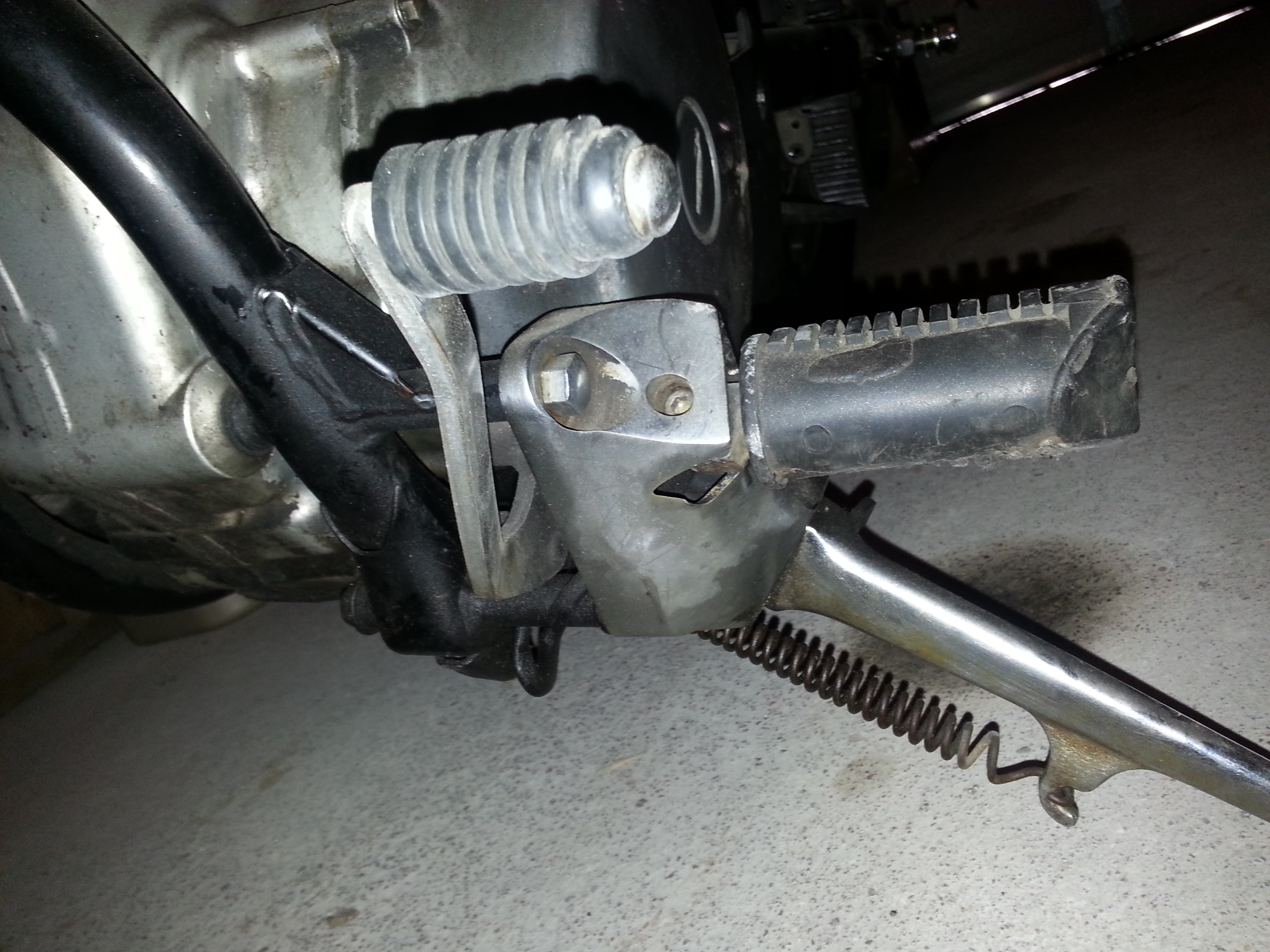 My last problem is when we transported it, the truck he used had a cover on the bed, so the only way he could get it over to my place was to lay it on its side. (I know, you should never lay a motorcycle down for any length of time but I didnt have a say in it, and it didnt have gas in it (yay?)) And when we got it into my garage, I noticed the left side foot peg was loose. When I went to tighten it, it looks like the metal behind the peg bent and sheared off. Do I need to get a new foot peg bracket or is there another way to hold it in place? The pic I posted with this is the backside of the left foot peg, where it looks like there is metal missing.