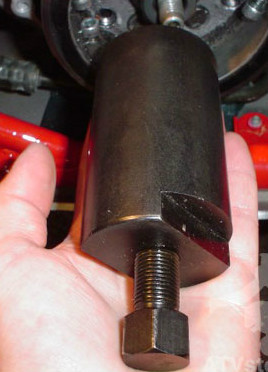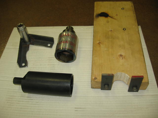 Here are the pictures of the tools I used. The mag puller I bought from an eBay seller, it was about $ 80. The large socket was made by purchasing a cheap socket at Tractor Supply, then cutting the hex section off the 3/4" drive section and welding in an extension. The flywheel holder was made from angle iron and an old 1/2" drive deep socket. The clutch holder is the wooden board with the metal tabs......I was getting tired of making tools by the time I got to this point.......it look crude but it holds the clutch basket just fine.