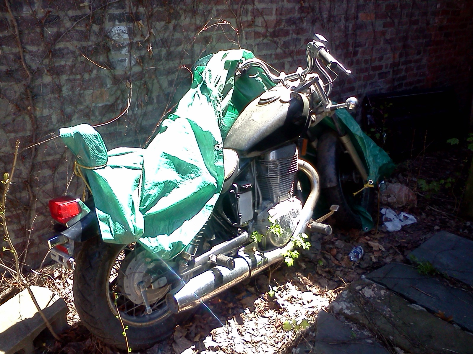 So yeah, awesome, free bike. As to why its free, its been sitting under a tarp for 6 years, exposed to the elements. I rode out today to look at it, and though I was expecting worse, its still what you would expect. There is no major frame rust (from what I could see), looks to be bone stock. Hell, the tires were still inflated and it still had chrome left on it.