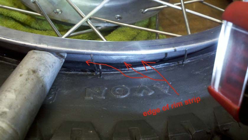 Here's a pic to illustrate how to check that your rim strip is still in place.  Go around the rim with the tire tool about every 8", move the bead away from the rim, and look down inside there to make sure the edge of the rim strip is in place.  The pic is not all that great, I had to add some arrows to point out the exact edge.