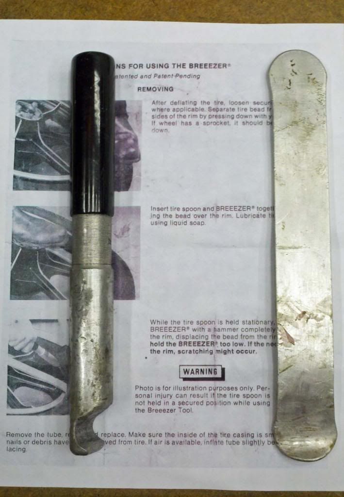 To get the tire on and off, use some sort of tool made to handle beads on motorcycle tires. I have a Breeezer, but I don't think they are available anymore. It came with a tire spoon as shown below. Over the past 40 years that set has been used hundreds of times on my bikes and friends' bikes. We've done 22 removes/installs just during the Double RYCA build.