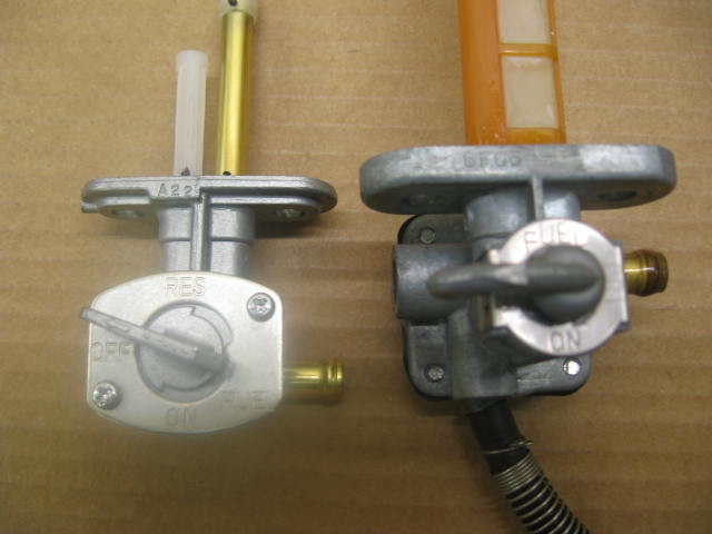 The original vacuum petcock and the OEM Raptor 660 petcock.  Notice how the fuel outlet on the Raptor is a metal tube that is flared....and not machined like the chinese copy.  The Yamaha part has a larger outlet that the chinese copy....and that outlet size matches the orignal one used on the Savage.  If you use the chinese one....you willlhave to install a smaller hose or use a screw type clamp to get the orignal hose to seal.