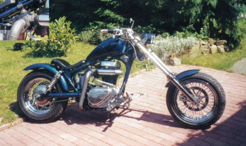 Mikuni BST40, K&N filter, Stage2 cam, Verslagen tensioner, Sportster muff, 120 proof moonshine, Pirelli MT 66 tourers... and a chain conversion too !