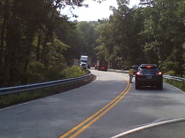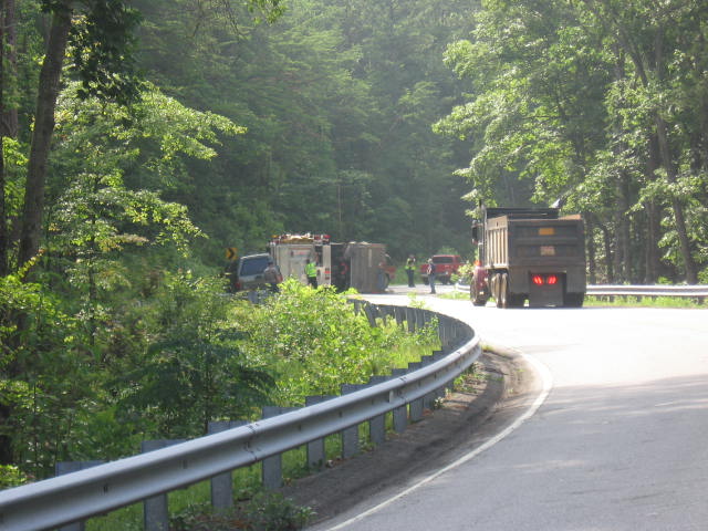 The photos are taken where the folks stopped uso to allow traffic from the other direction to go through.  We actually had to drive through some of the gravel that came out of the truck and was still on the road.  The emergency folks where sure to point out the gravel to us....so that us bikers would not lose control on the gravel and make more "emergency" work for them!